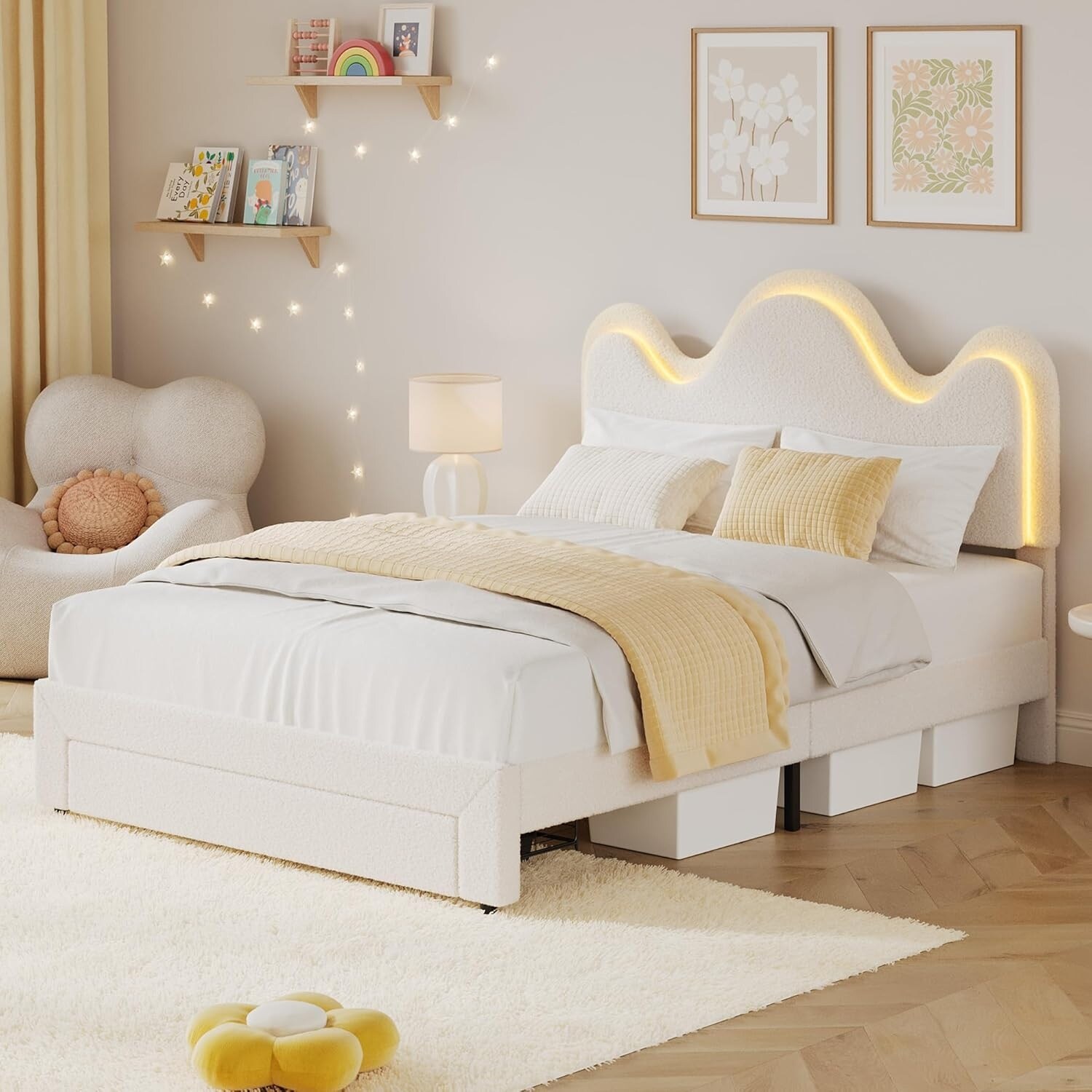 Adjustable Headboard Full Bed Frame with LED Lights, Storage Drawer & Wooden Slats, No Box Spring Needed