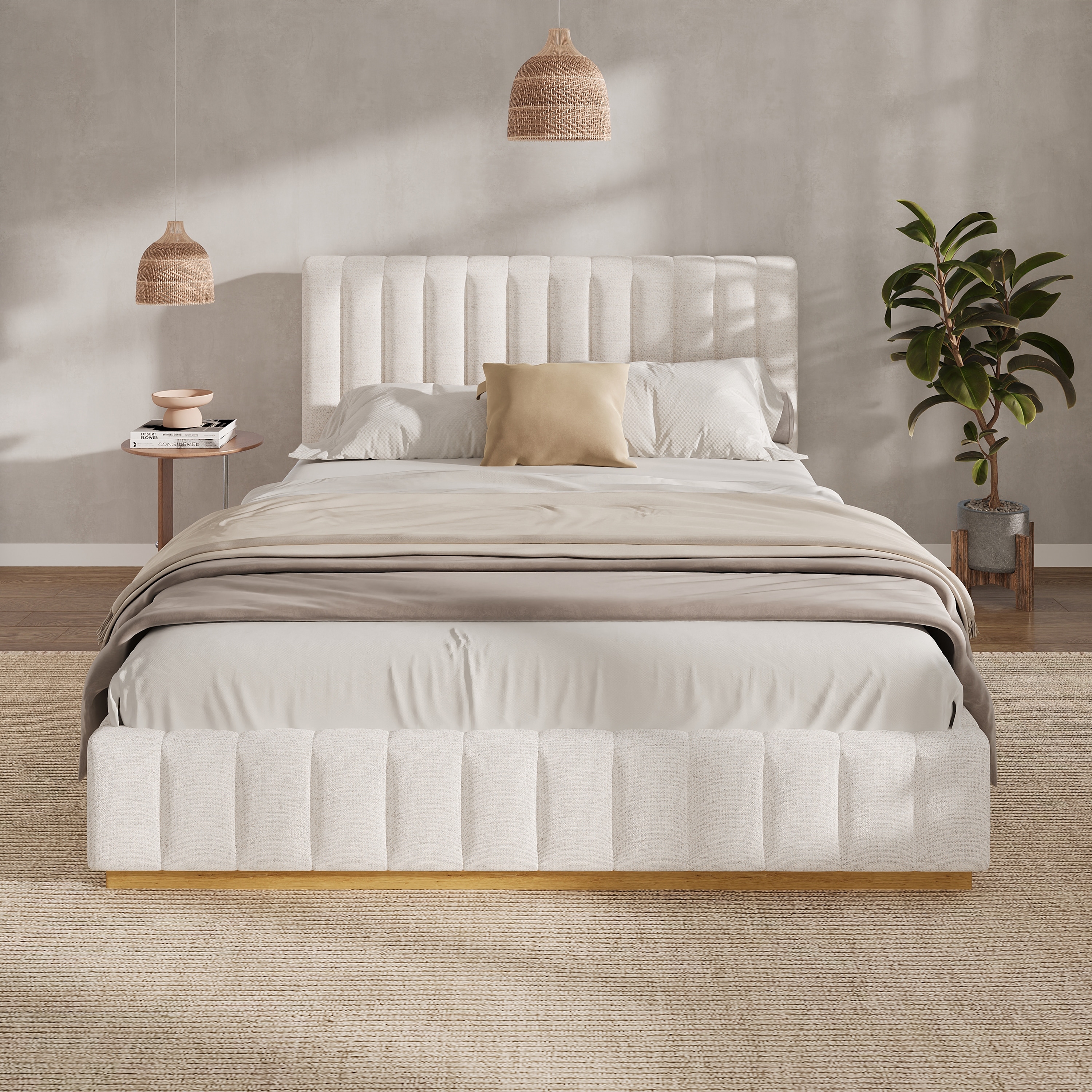 Queen/King Size Bed Frame With Linen Upholstered Thick Headboard, Solid Wooden Base, Beige