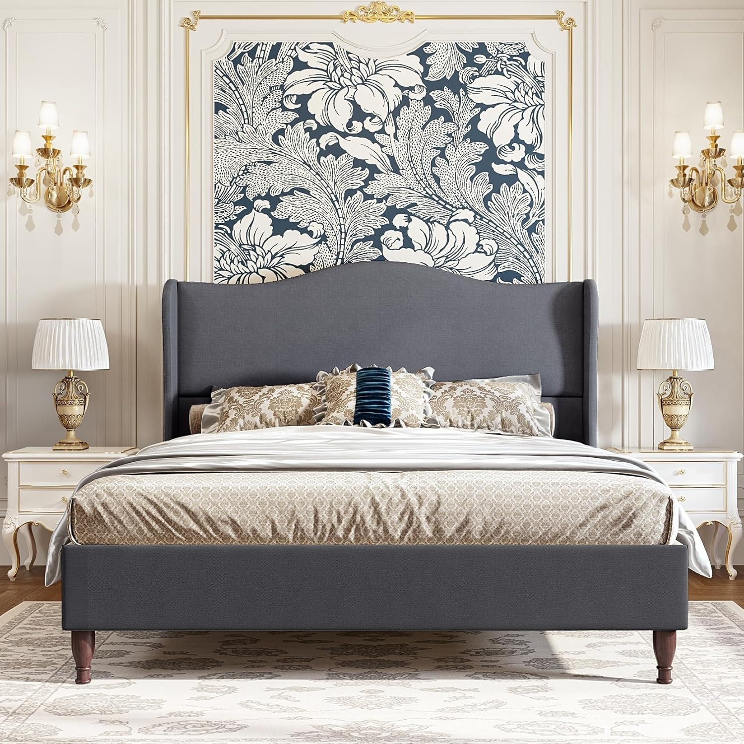 Full Size Upholstered Platform Bed with Tall Wingback Headboard, Retro Design, Easy Assembly, Grey