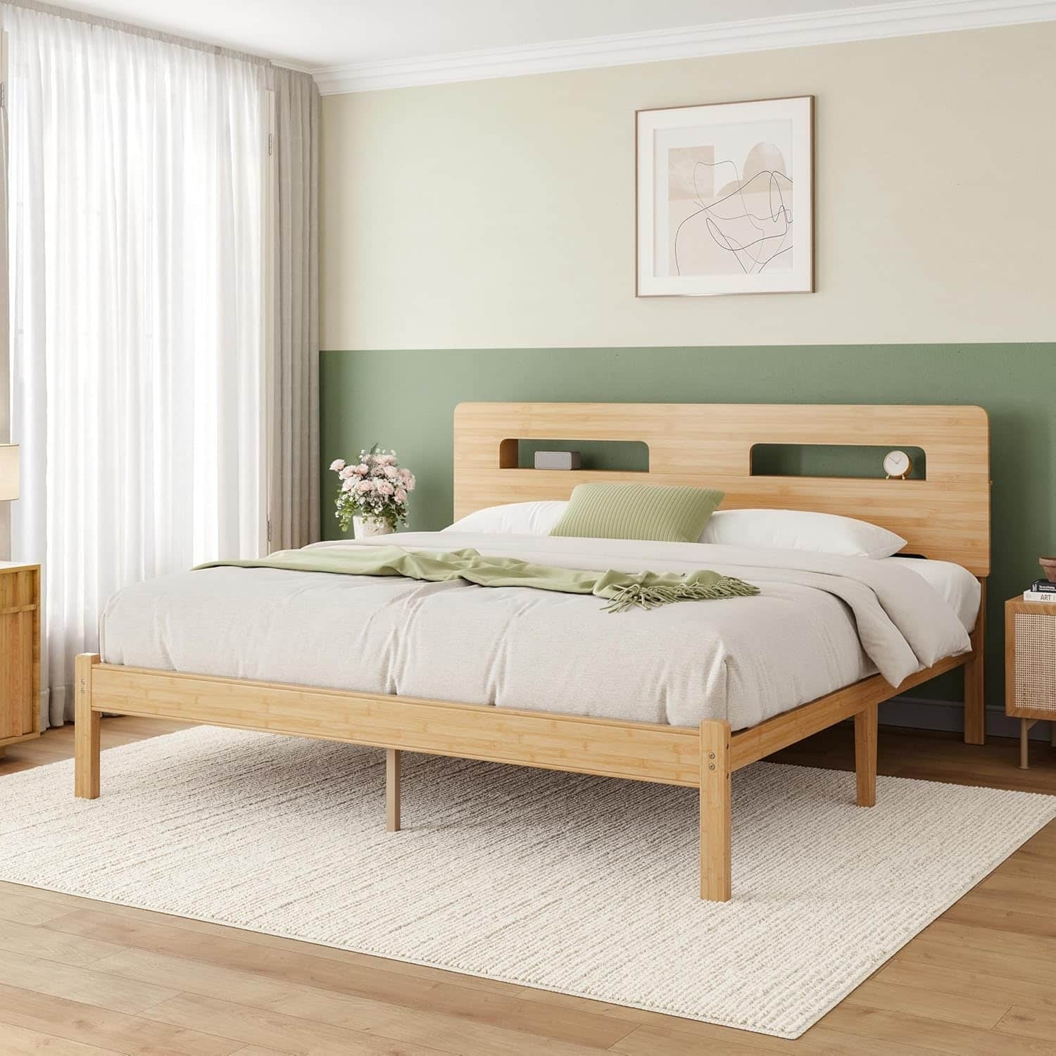 Solid Bamboo King Size Bed Frame with Storage Headboard, 14 Inch Platform Bed, Sturdy and Stable, Easy Assembly, Noise Free