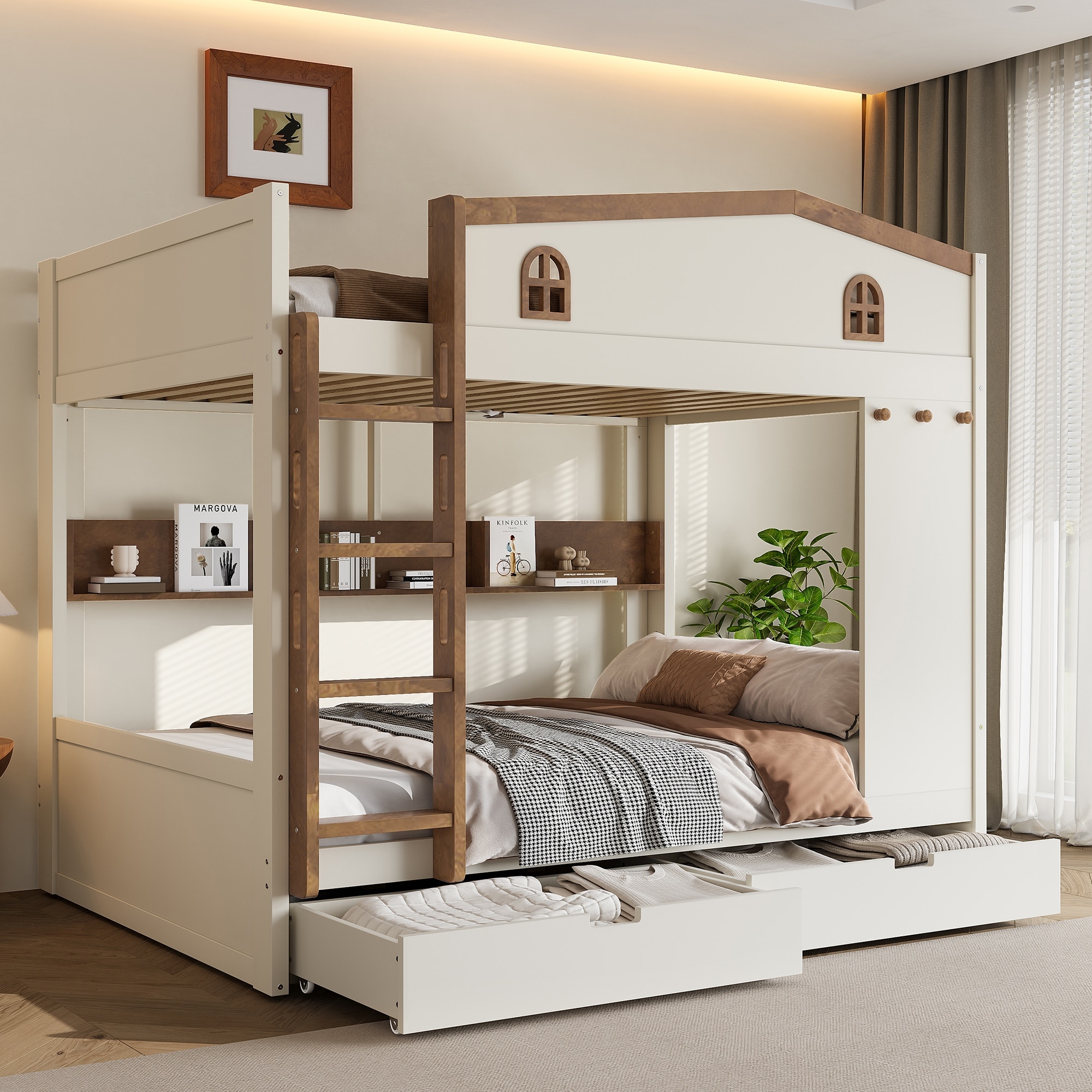 Queen over Queen Bunk Bed with Storage Drawers and Shelves, Solid Wood Bunk Beds with hooks