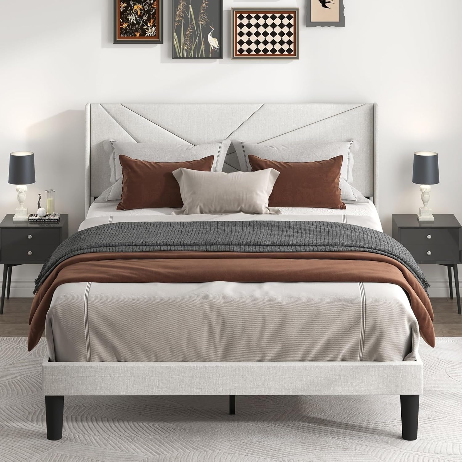 Queen Size Bed Frame with Upholstered Wingback Headboard, Easy Assembly Platform Bed, Noise-Free, No Box Spring Needed