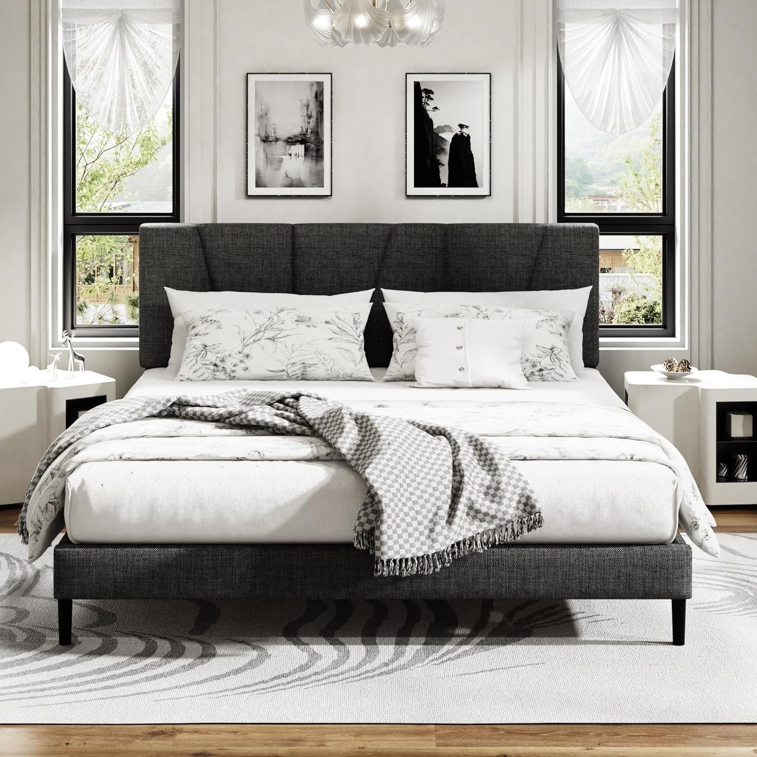 Modern King Size Platform Bed Frame with Upholstered Headboard, Wooden Slats, Noise-Free, Easy Assembly, Dark Grey