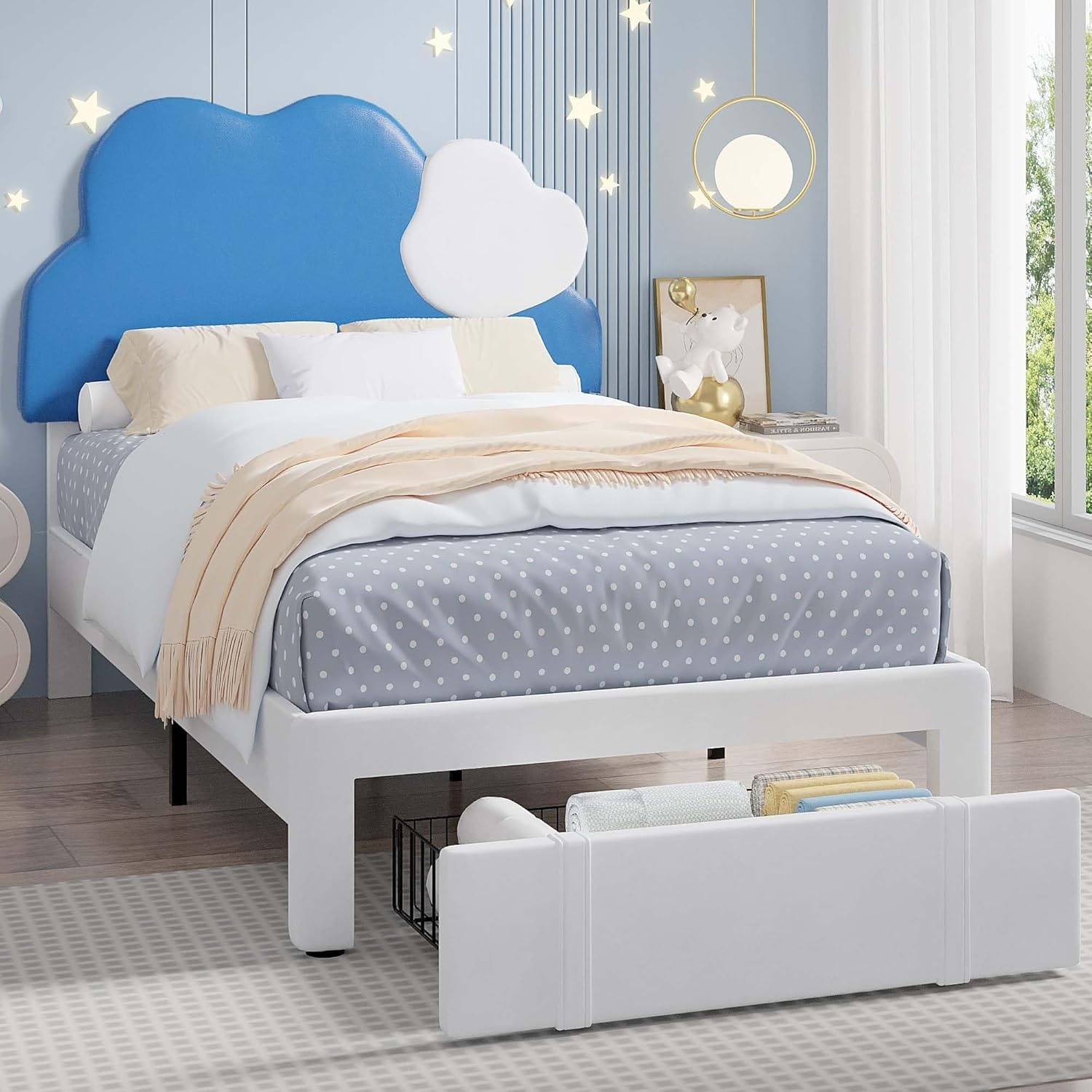 Cloud-Shaped Twin Upholstered Bed Frame with Storage Drawer, Noise-Free Design, 650lbs Capacity, Easy Assembly for Kids