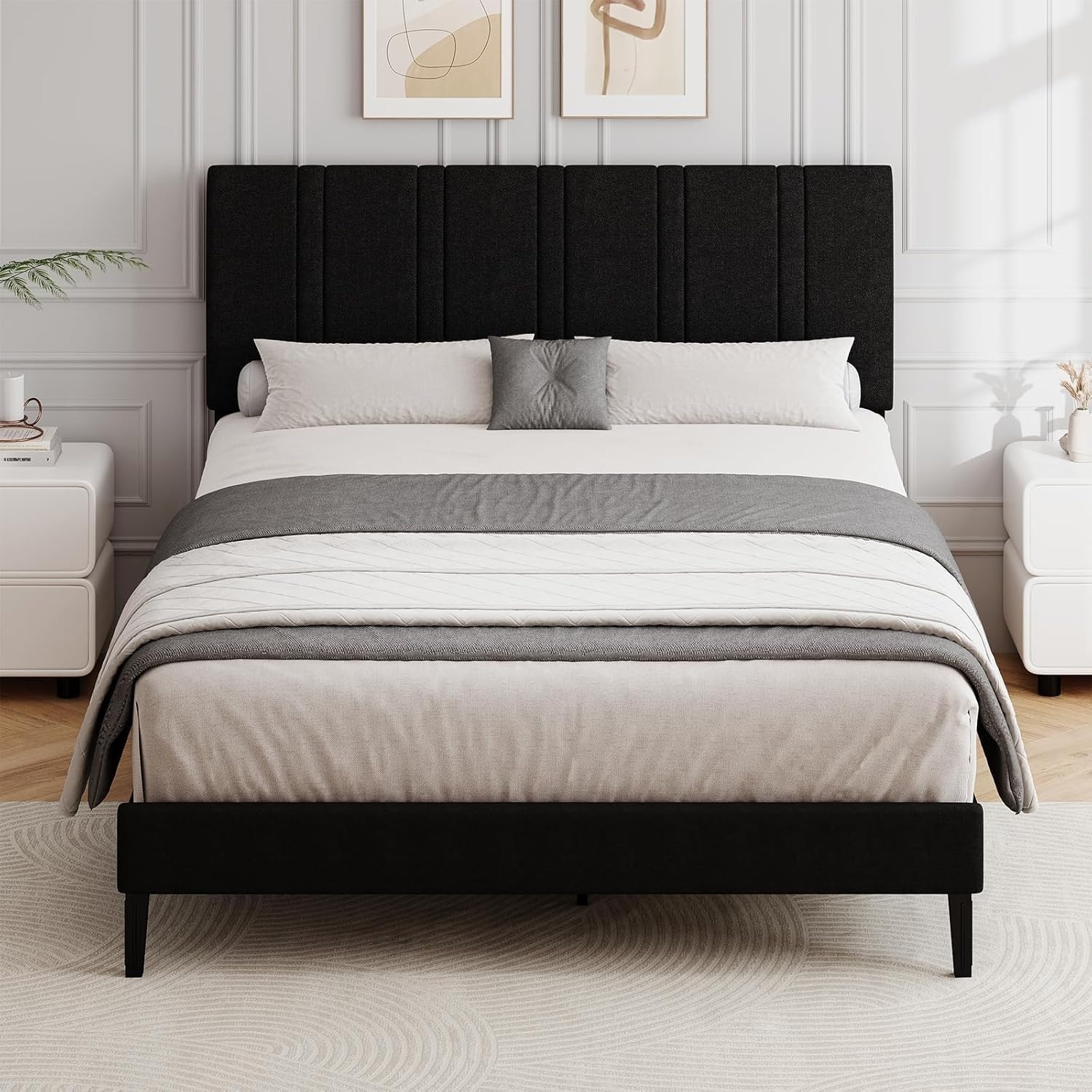 Full Size Upholstered Platform Bed Frame with Headboard, Black, Easy Assembly, Noise-Free Design