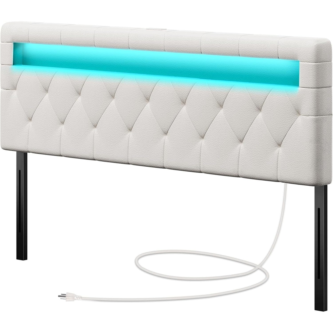 Adjustable LED Headboard for Full Size Bed with USB/Type-C, 60,000 Color Options, Wall Mountable, White Leather