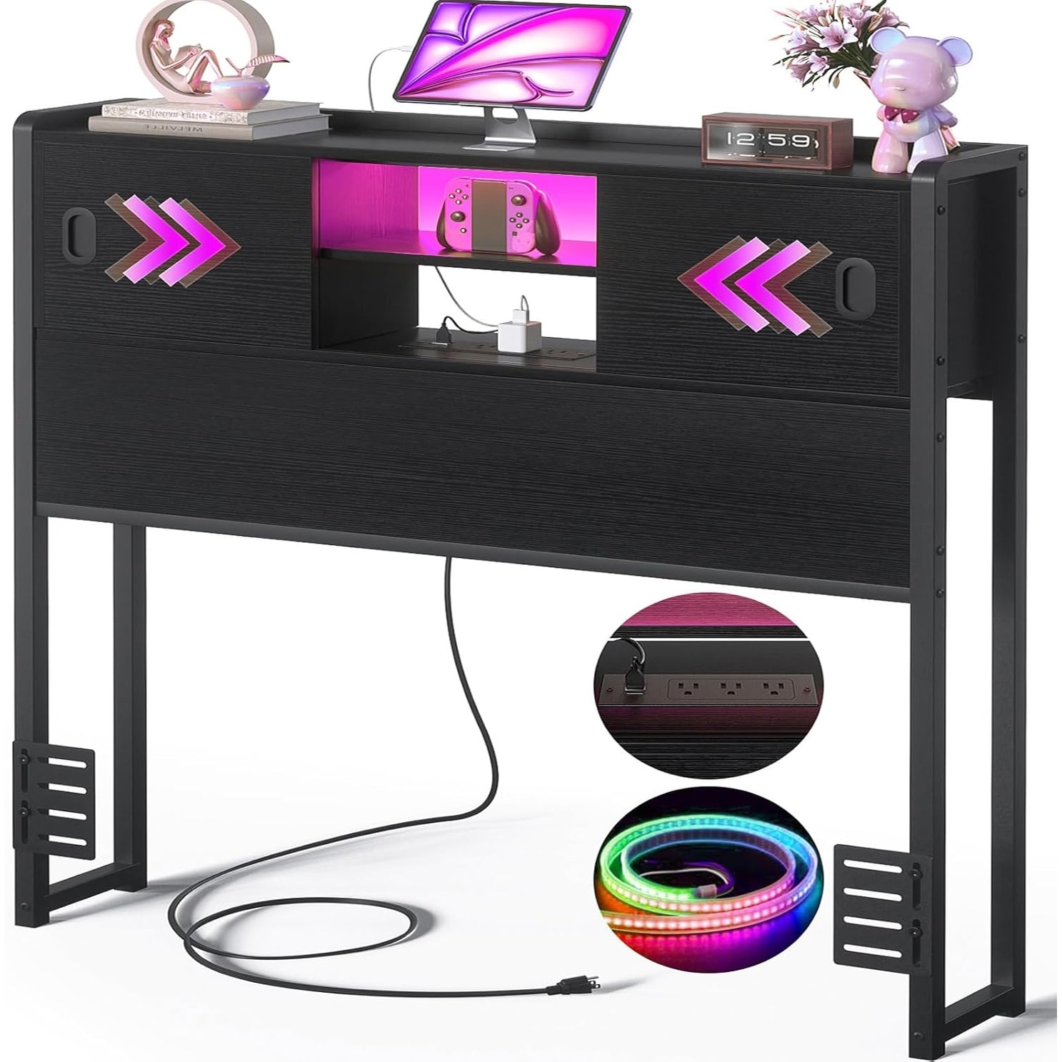 Twin Size Storage Headboard with USB, Outlet & LED Lights, Sliding Doors & Bed Adapter, Black