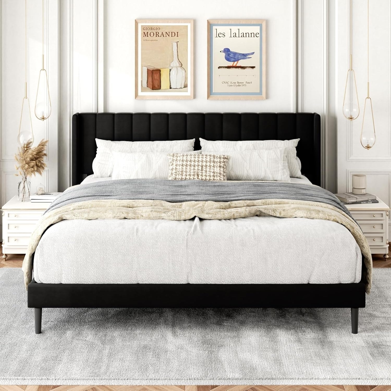 Modern Wingback Upholstered Platform Bed Frame with Wooden Slat Support, Easy Assembly, Black