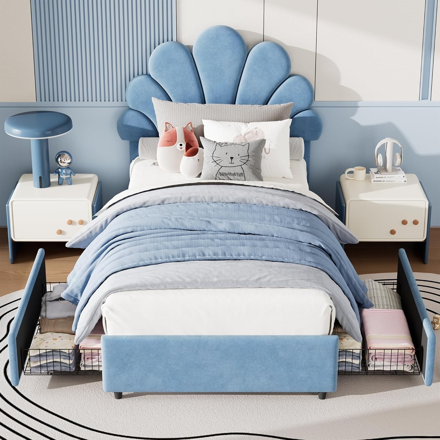 Twin Size Bed Frame for Kids Girls Boys - Upholstered Princess Velvet Platform Bed with Headboard