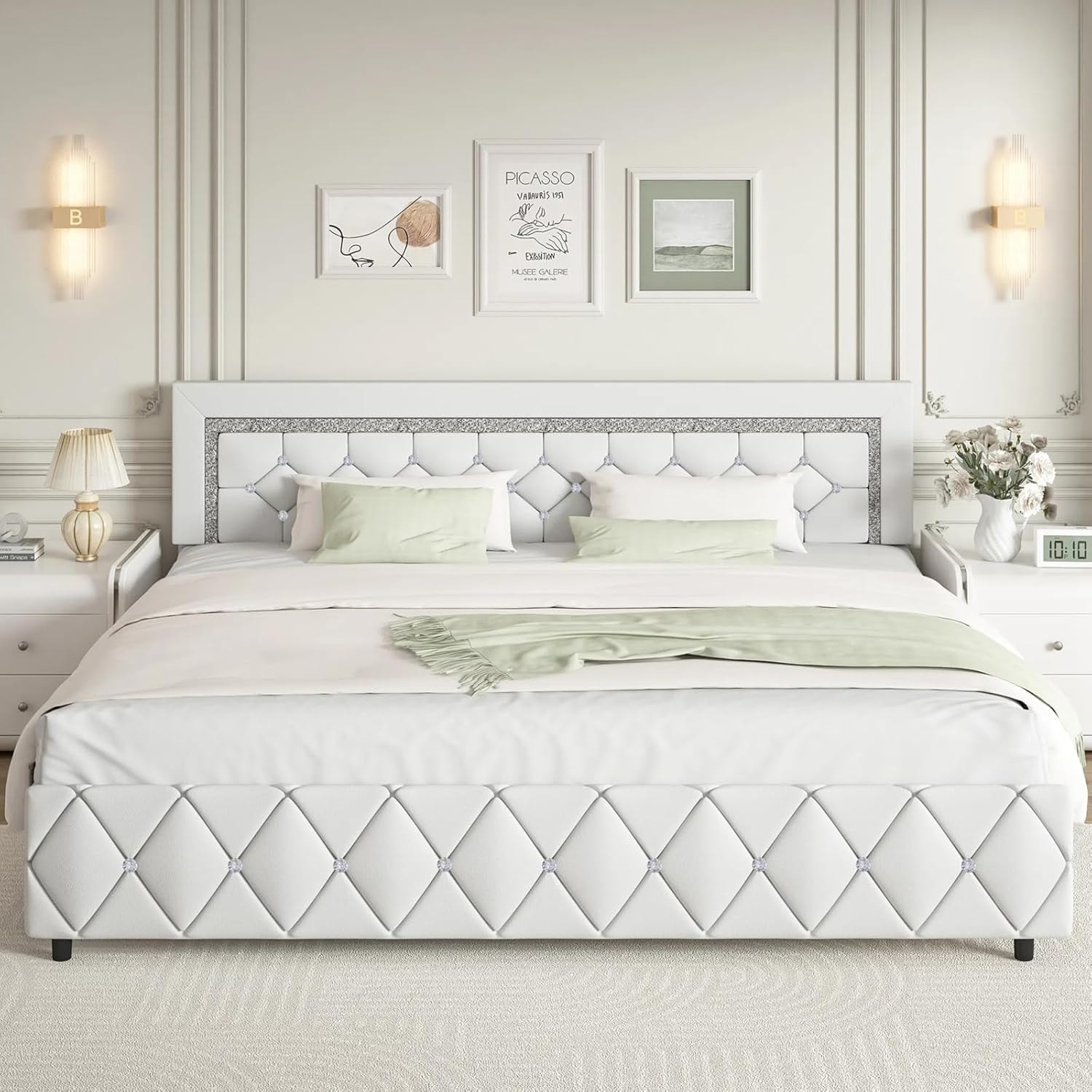 King Size Upholstered Bed Frame with Diamond Tufted Headboard, Modern Platform Bed with Wooden Slats, Easy Assembly, White