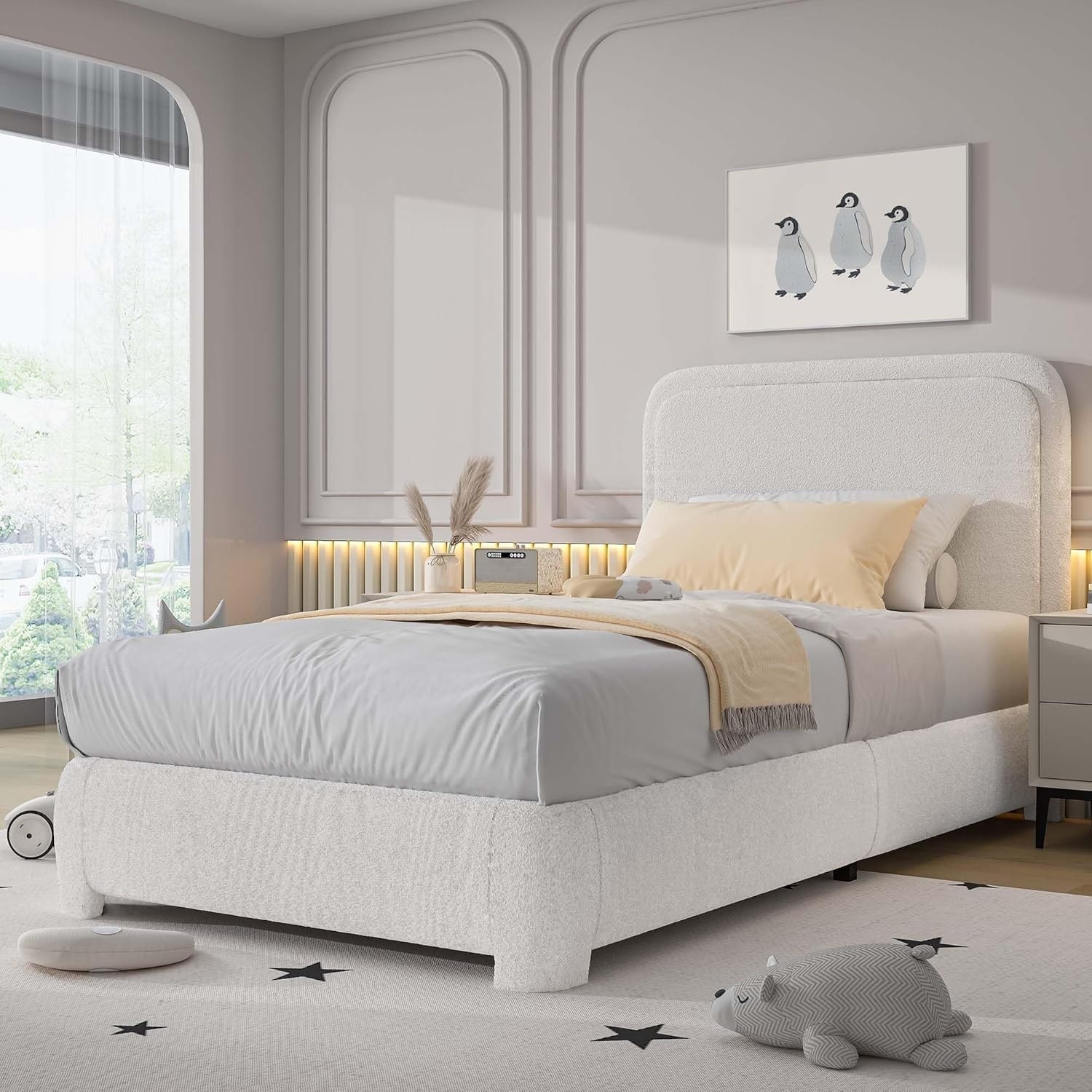 Twin Bed Frame with Cloud Boucle Upholstered Headboard, Modern Minimalist Design, Soft Rounded Corners, Easy Assembly, White