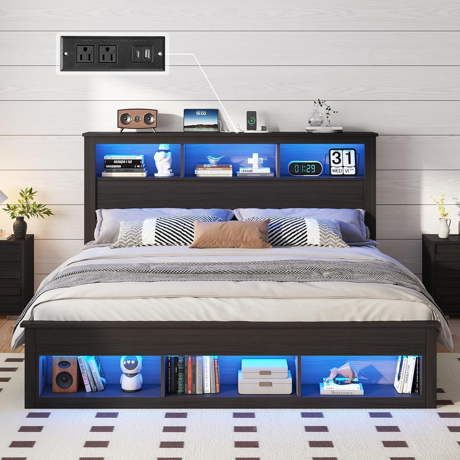 Queen Size Farmhouse Wood Platform Bed with LED Lights, Charging Station, and Storage Headboard, No Box Spring Needed, Black