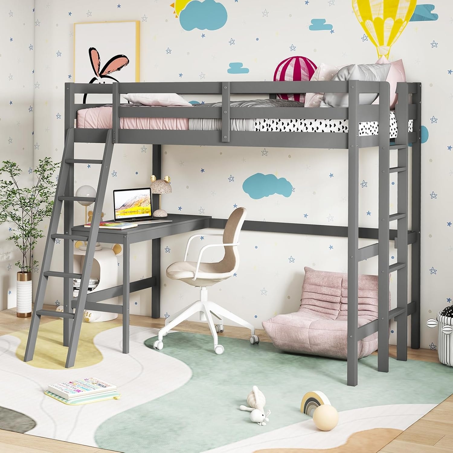 Solid Wood Twin Loft Bed with Built-in Desk, Space-Saving Design & Safety Guardrail