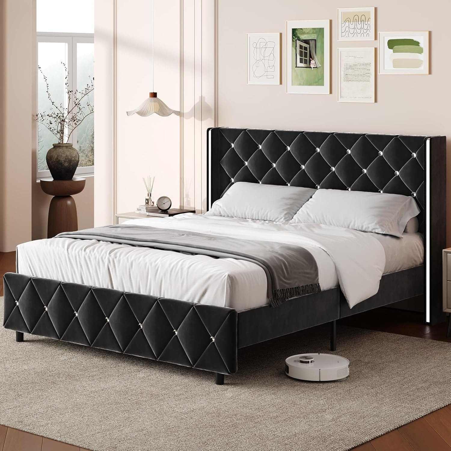 Full Bed Frame with Headboard, Wingback Design, Velvet Upholstery, Wooden Slats, Easy Assembly, Black