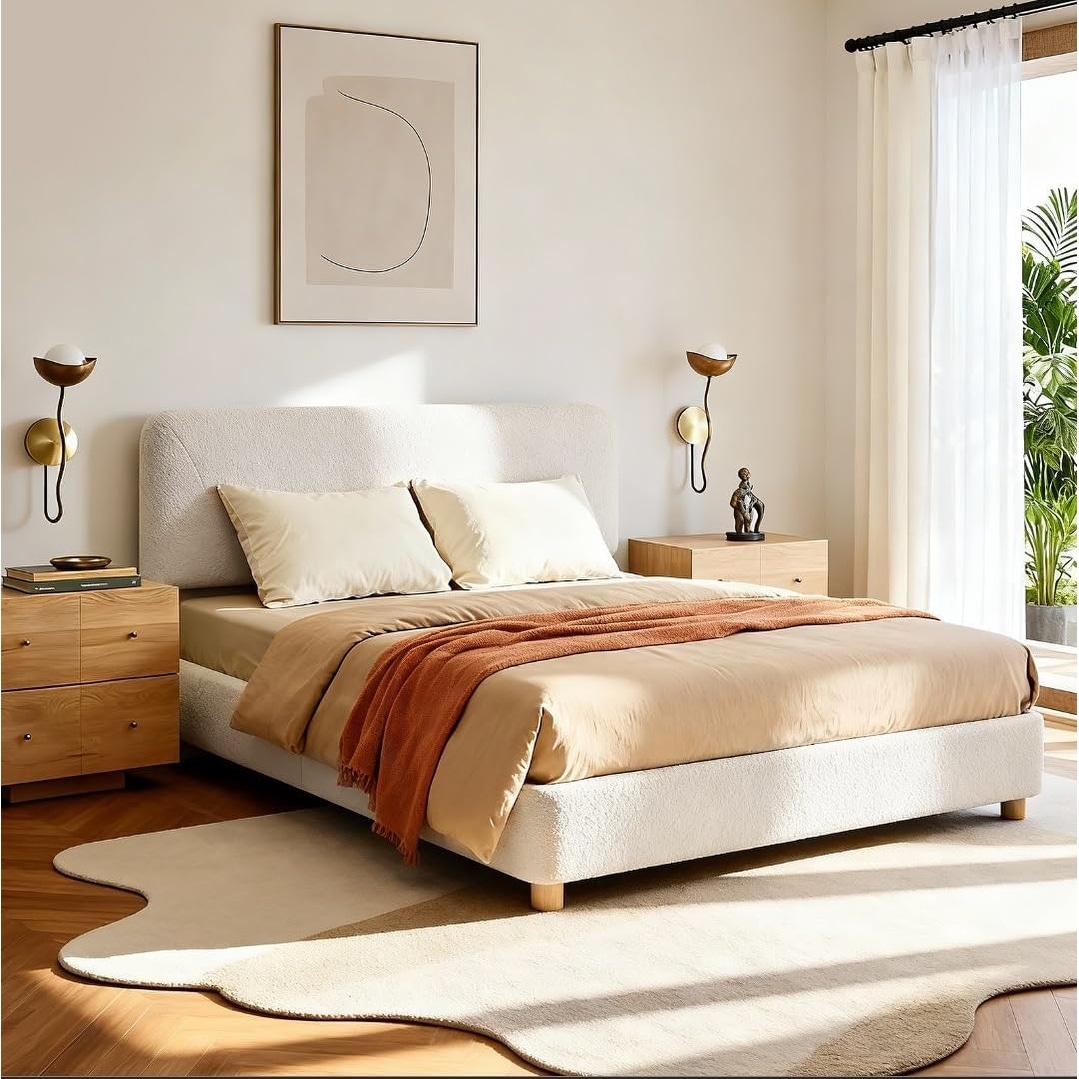 Full Size Upholstered Boucle Platform Bed Frame with Adjustable Headboard & Solid Wood Legs