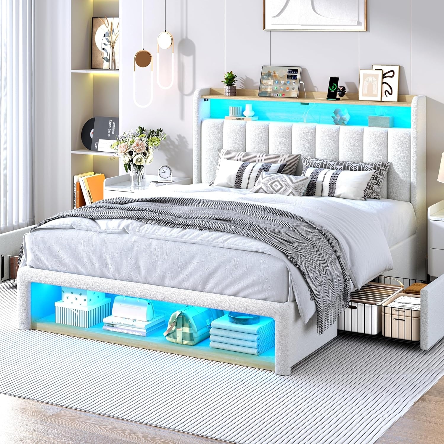 Queen Upholstered Cloud Bed Frame with LED Lights, Storage Drawers, Charging Station & Wingback Headboard - No Box Spring Needed