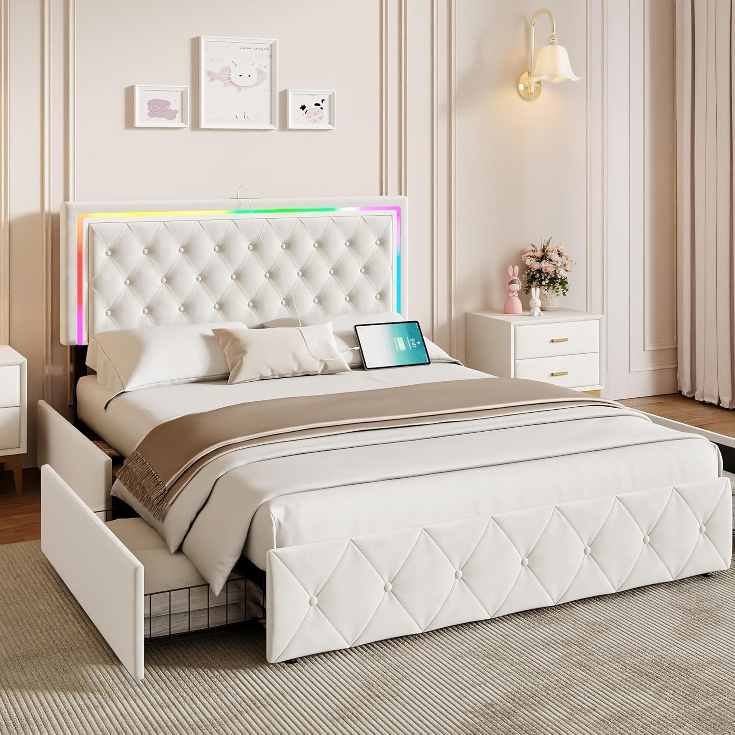 Queen Bed Frame with LED Lights, Storage Drawers, and Charging Station, No Box Spring Needed