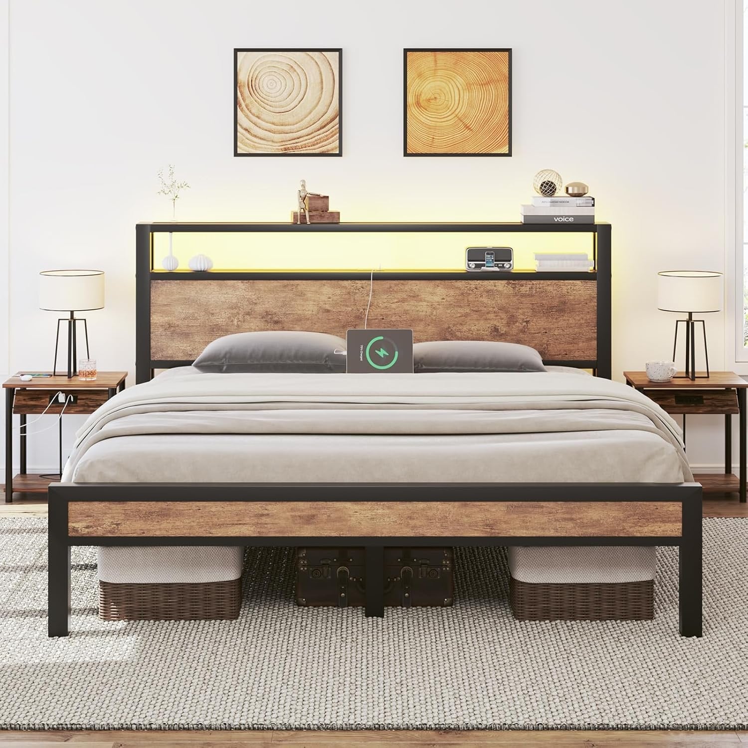Queen Bed Frame with Adjustable Headboard, LED Lights, USB Charging, and Under-Bed Storage