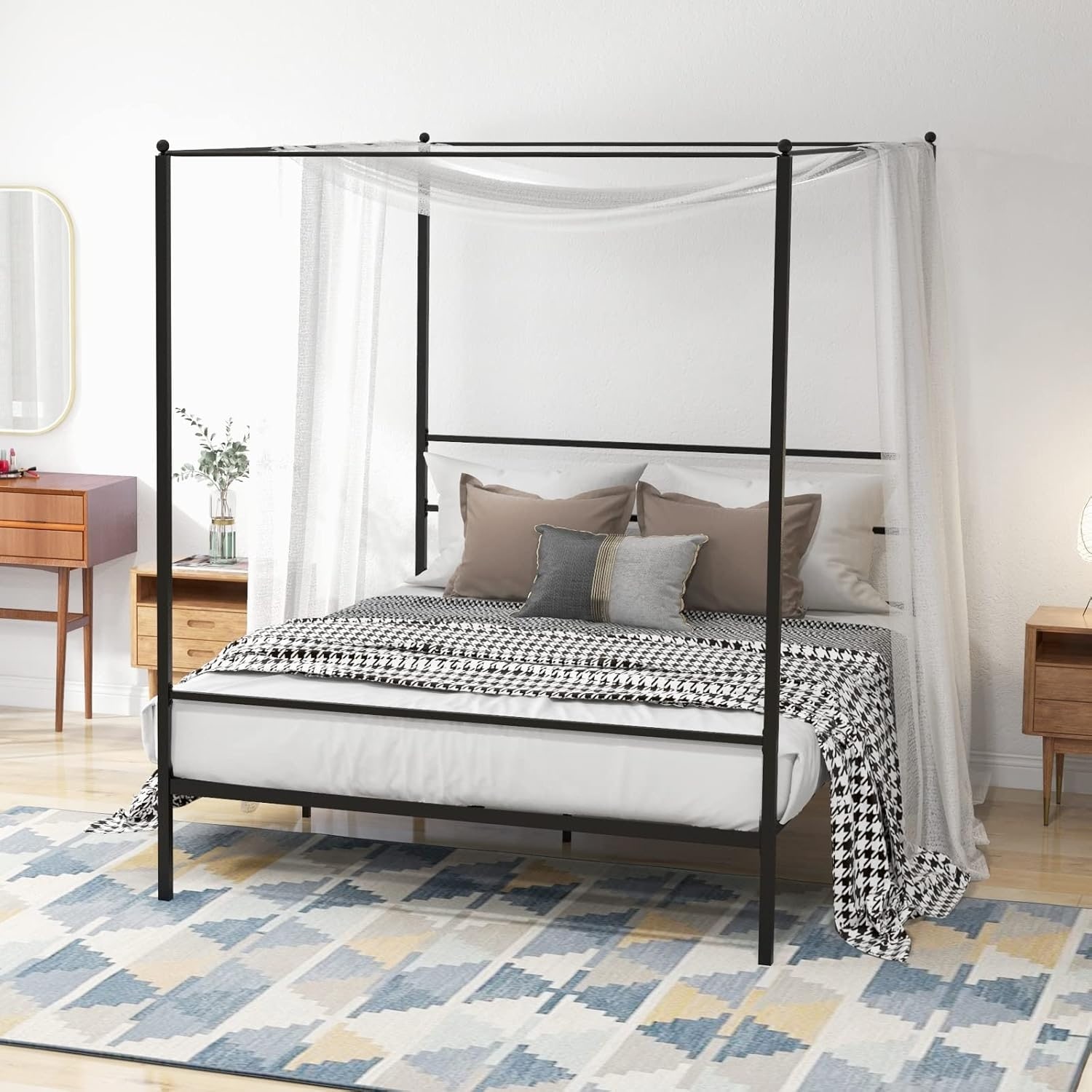 Modern Queen Size Metal Canopy Bed Frame with Headboard, Heavy-Duty Platform Bed, No Box Spring Needed, Easy Assembly, Black
