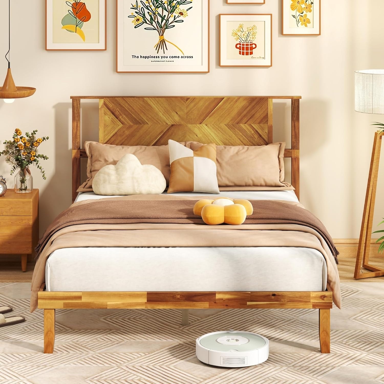 Full Size Solid Acacia Wood Platform Bed Frame with Headboard and Under-Bed Storage, No Box Spring Needed