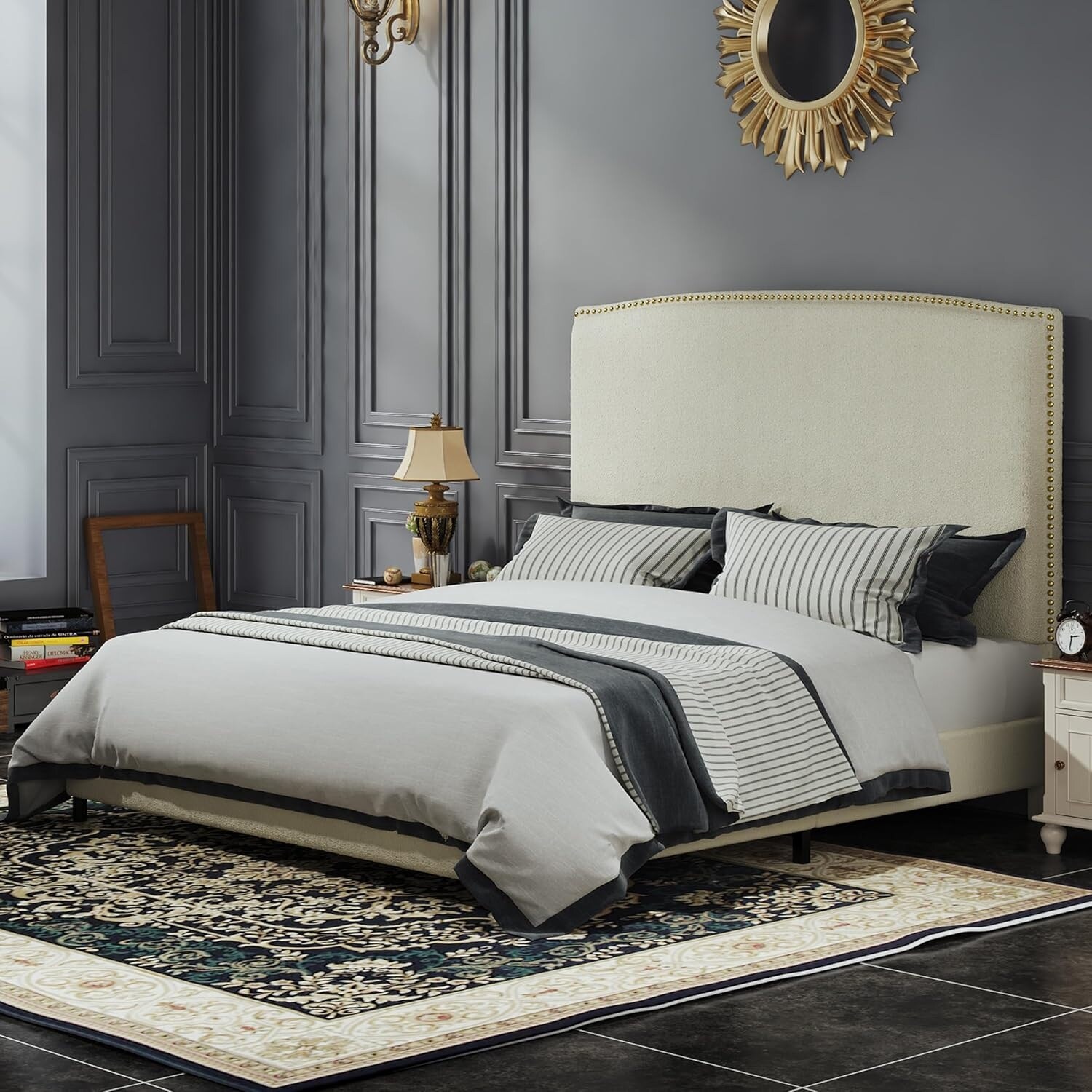 Queen Size Upholstered Platform Bed with Headboard, Cream Boucle Fabric, Easy Assembly, No Box Spring Needed