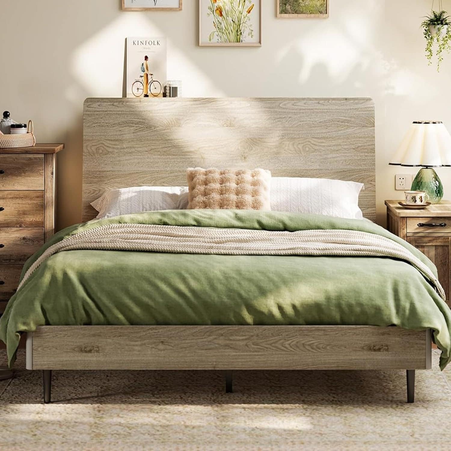 Queen Wood Bed Frame with Ergonomic Headboard, Storage Shelf, Noise-Free, No Box Spring Needed - Beige