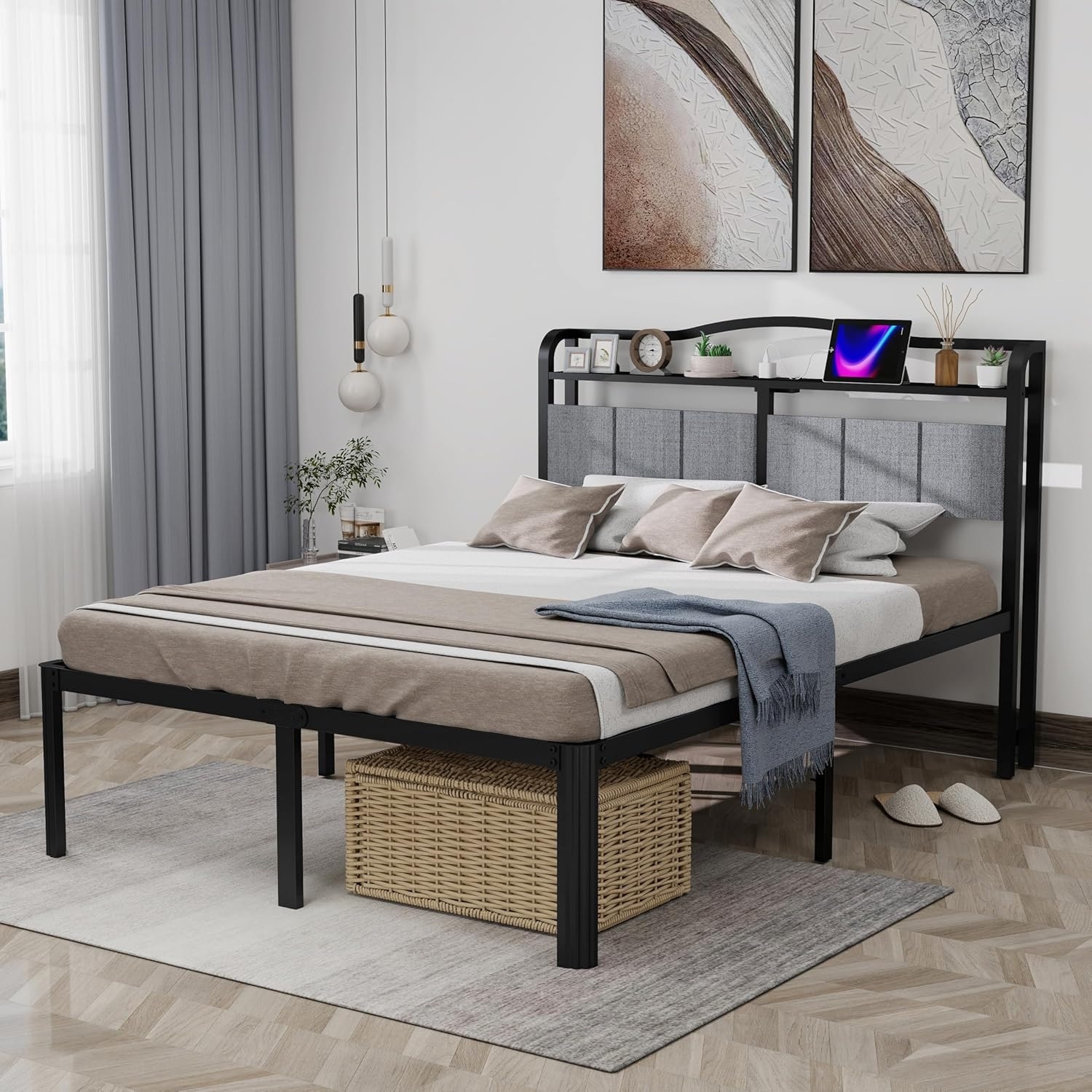 Queen Bed Frame with Charging Station, Fabric Headboard, Noise-Free Design, Under-Bed Storage, Modern Style