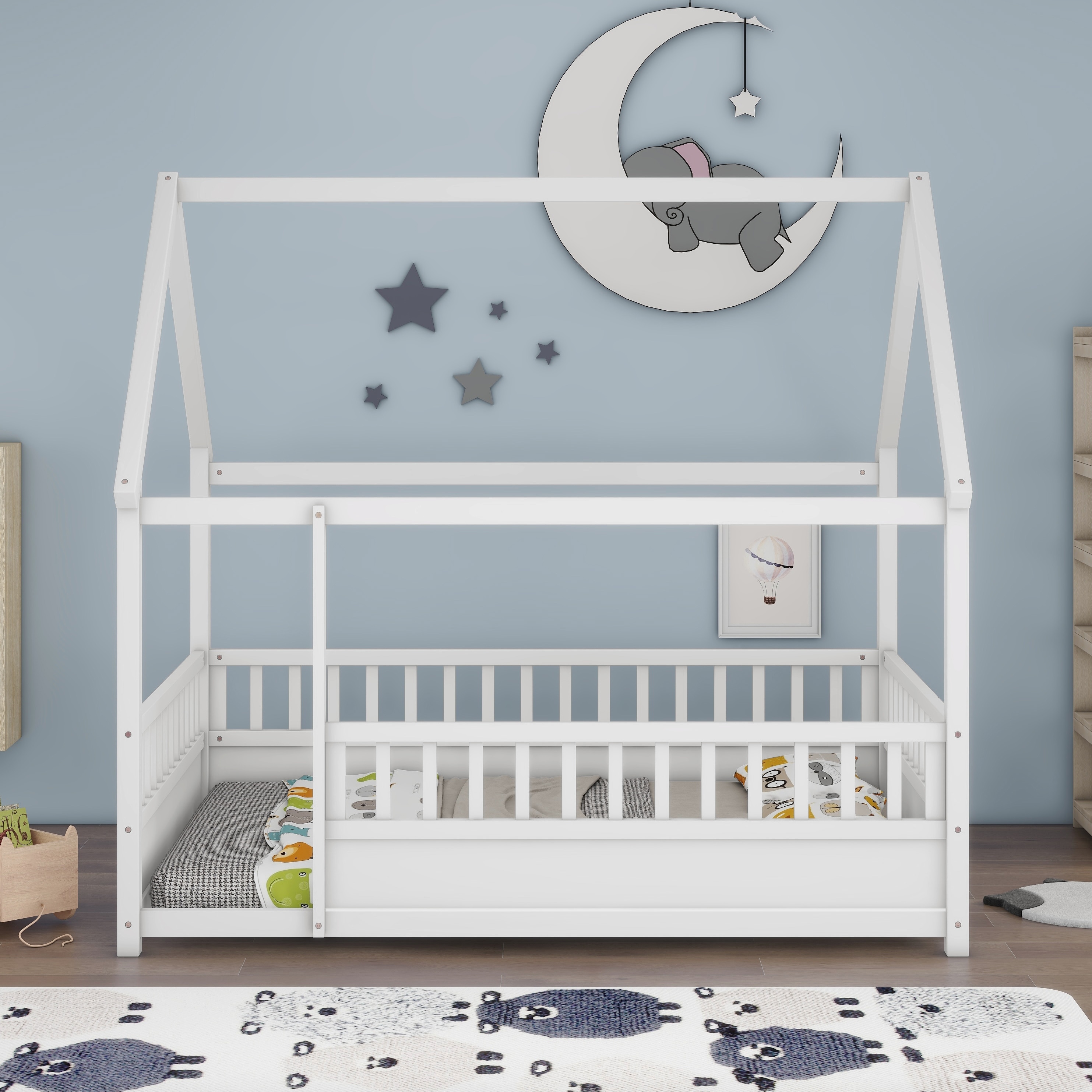 Full Size Floor Wooden Bed with House Roof Frame, Fence Guardrails, children's floor bed frame, White