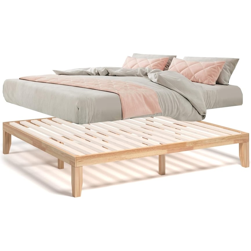 Queen Size Solid Wood Platform Bed Frame, Mid-Century Design, No Box Spring Needed, Natural Pine Finish