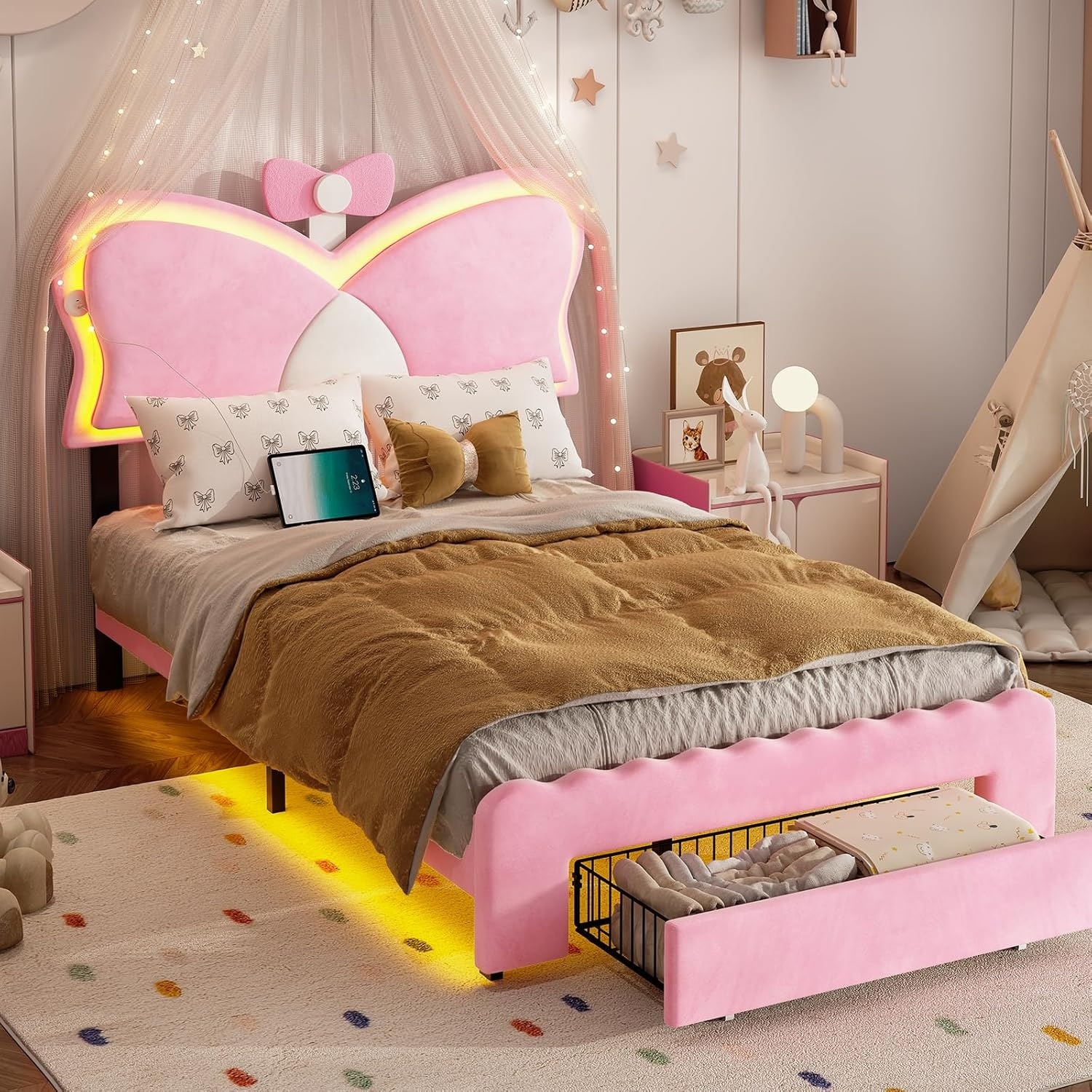 Pink Twin Bed Frame with Storage Drawer, LED Lights, Charging Station, and Adjustable Butterfly Headboard, No Box Spring Needed