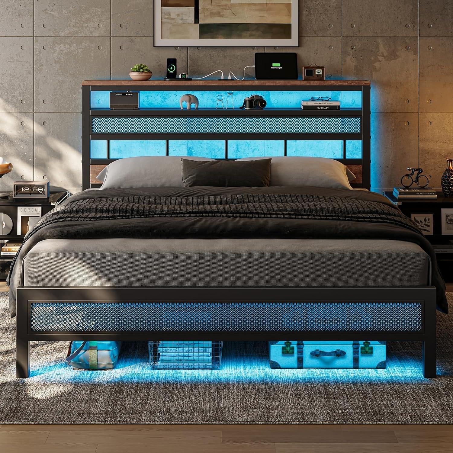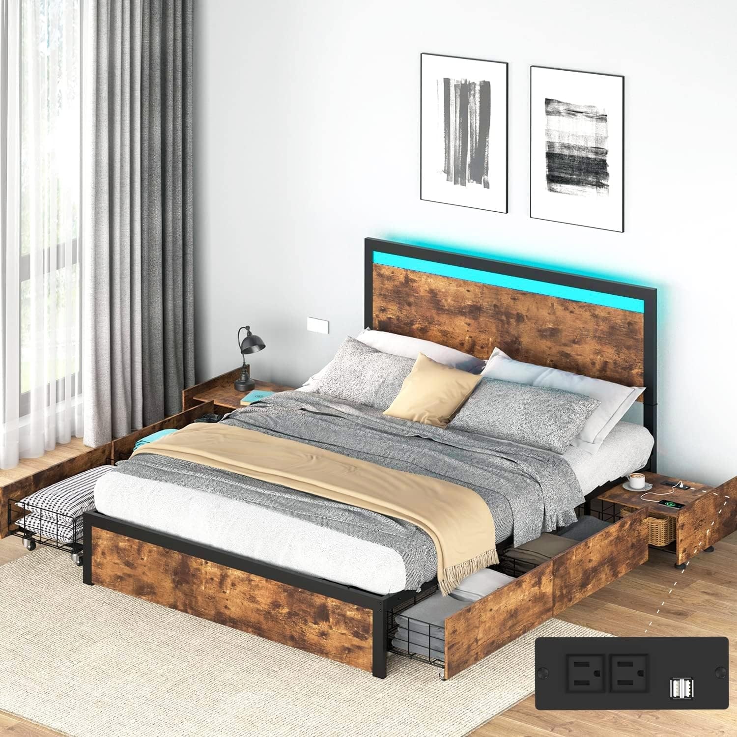 Queen Bed Frame with Storage Drawers, LED Headboard, Charging Station, and Nightstands, No Box Spring Needed