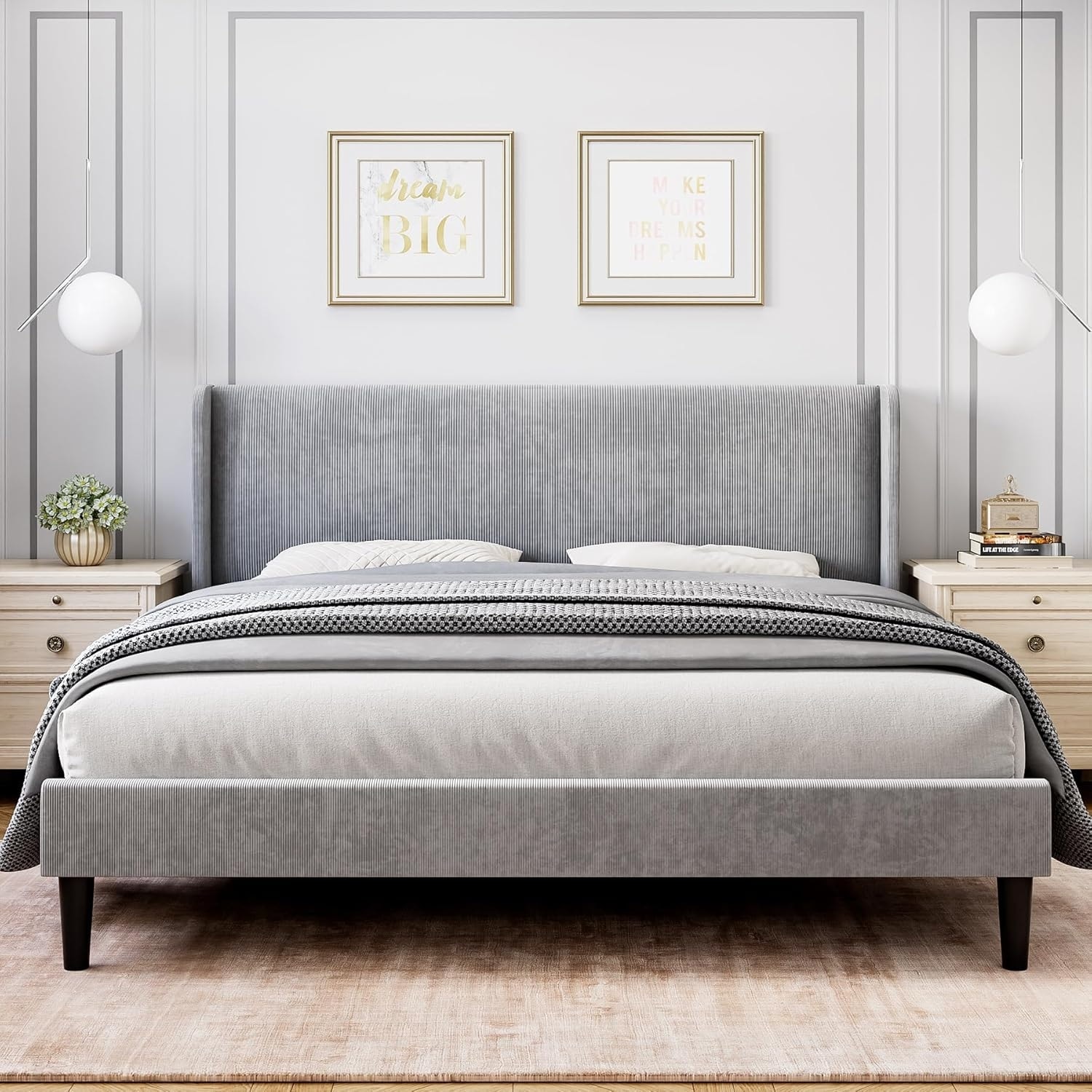 Queen Upholstered Bed Frame with Wingback Headboard, Velvet Platform Bed, Wooden Slat Support, Easy Assembly, Light Gray