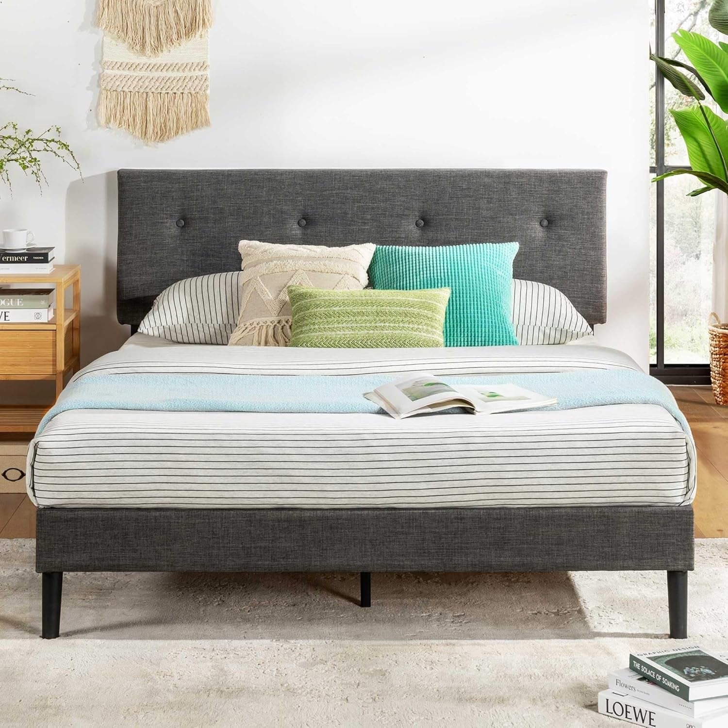 Queen Upholstered Platform Bed Frame with Button Tufted Headboard, Bamboo Slats, Noise-Free Design, Easy Assembly, Dark Grey