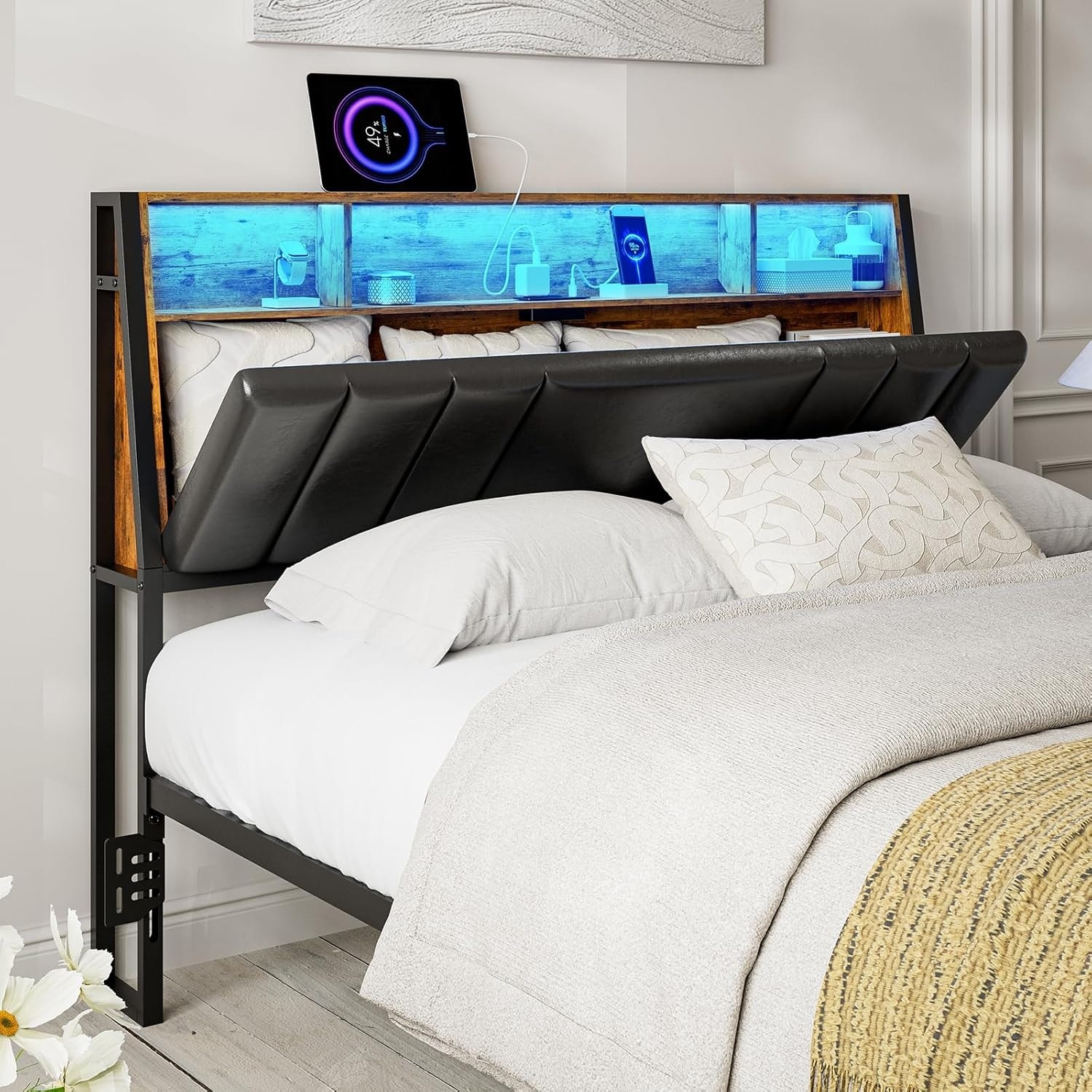 Full Size Upholstered Headboard with Hidden Storage, LED Lights, Charging Station, and Easy Assembly