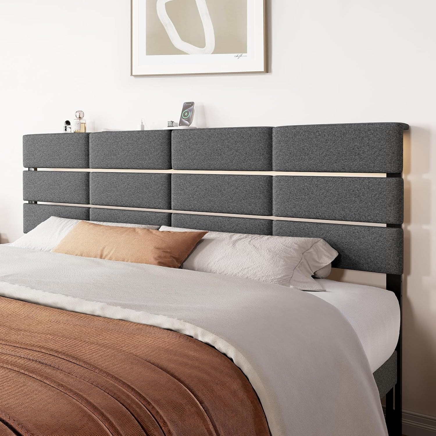 Adjustable Upholstered Headboard with LED Lights & Charging Station, Dark Grey