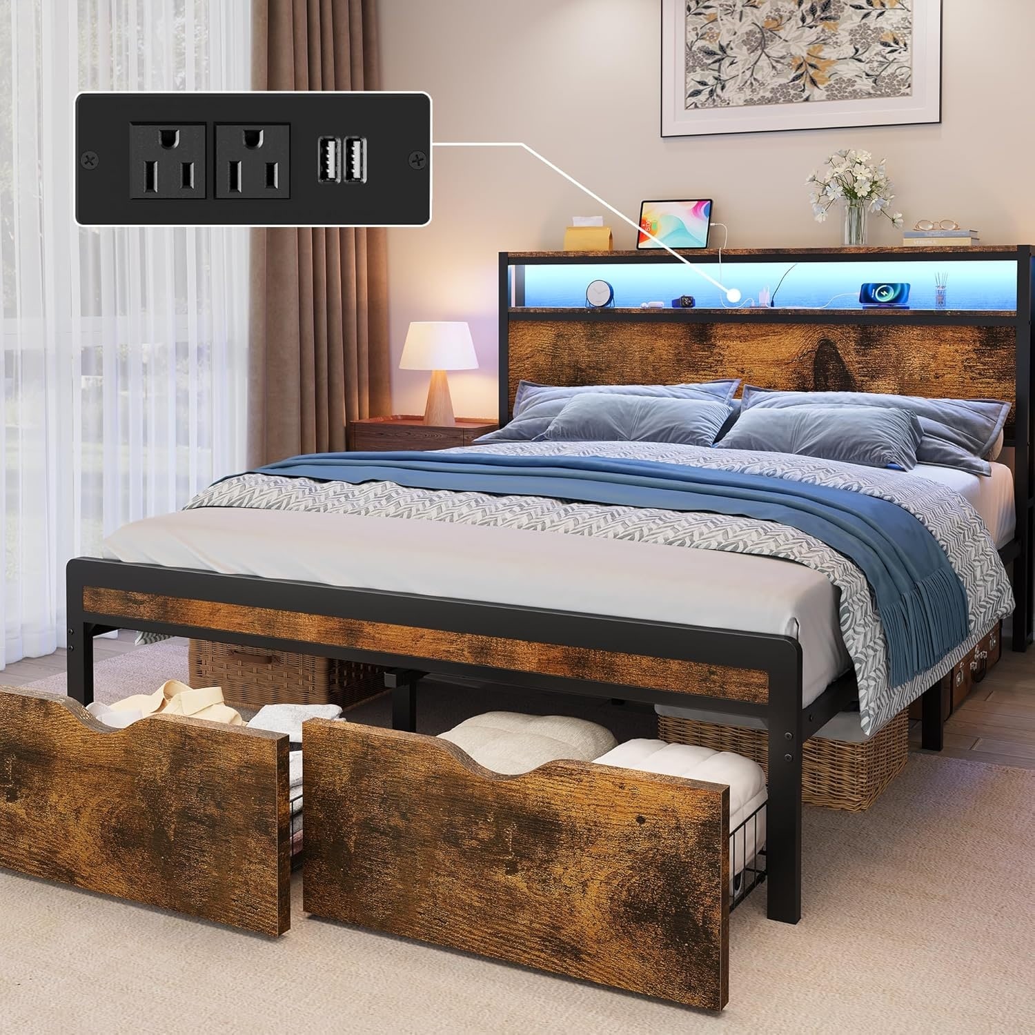 Full Size Metal Bed Frame with LED Lights, Charging Station, and Storage Drawers, Easy Assembly, Black Brown