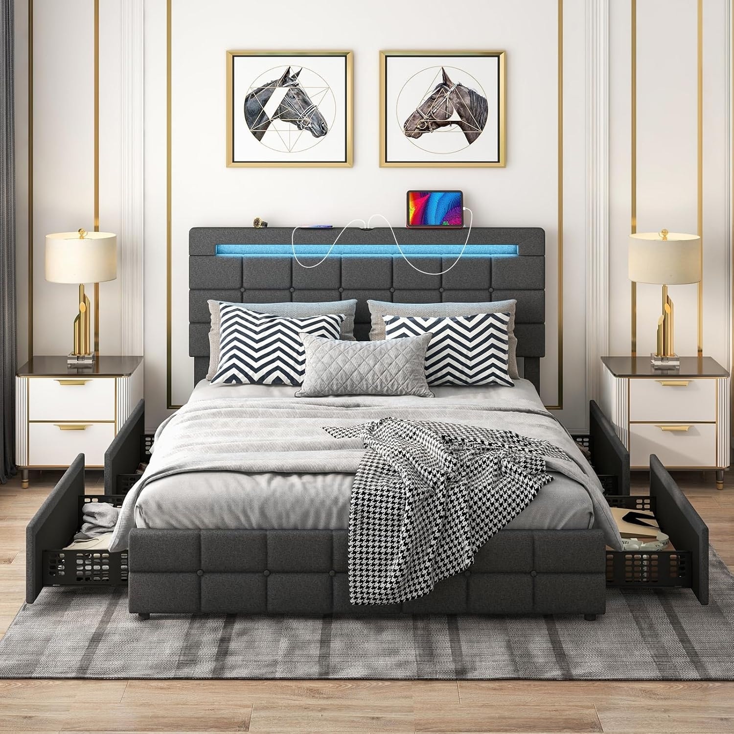 LED Platform Bed with USB Ports, Adjustable Headboard, 4 Storage Drawers, No Box Spring Needed