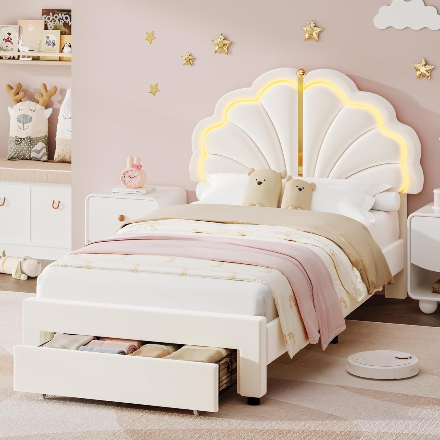 Velvet Upholstered Twin Princess Bed with LED Lights, Adjustable Headboard & Storage Drawers, No Box Spring Needed, Beige