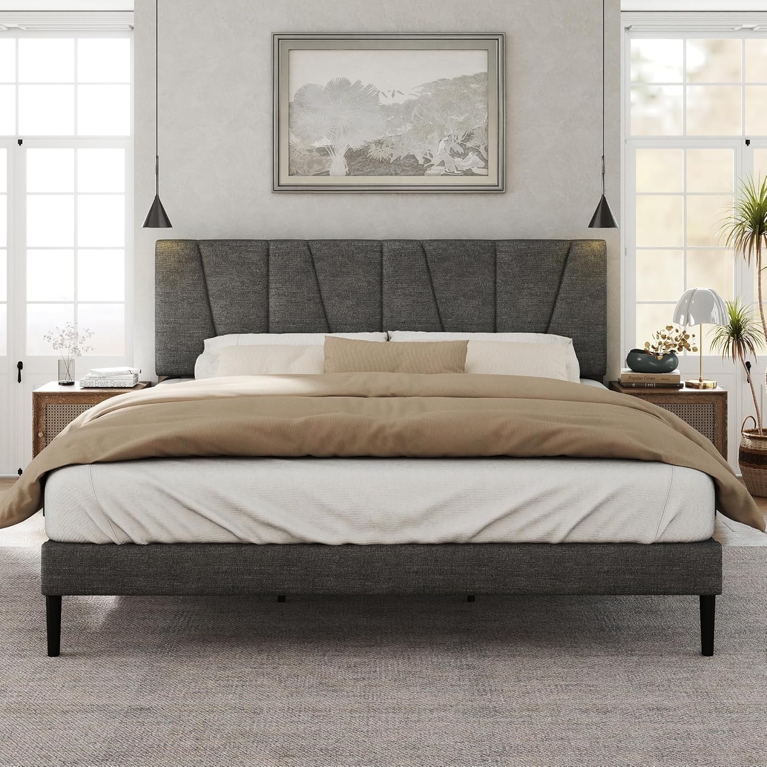 Queen Size Bed Frame with Fabric Headboard, Solid Wood Slats, Noise-Free, Easy Assembly, No Box Spring Needed, Grey