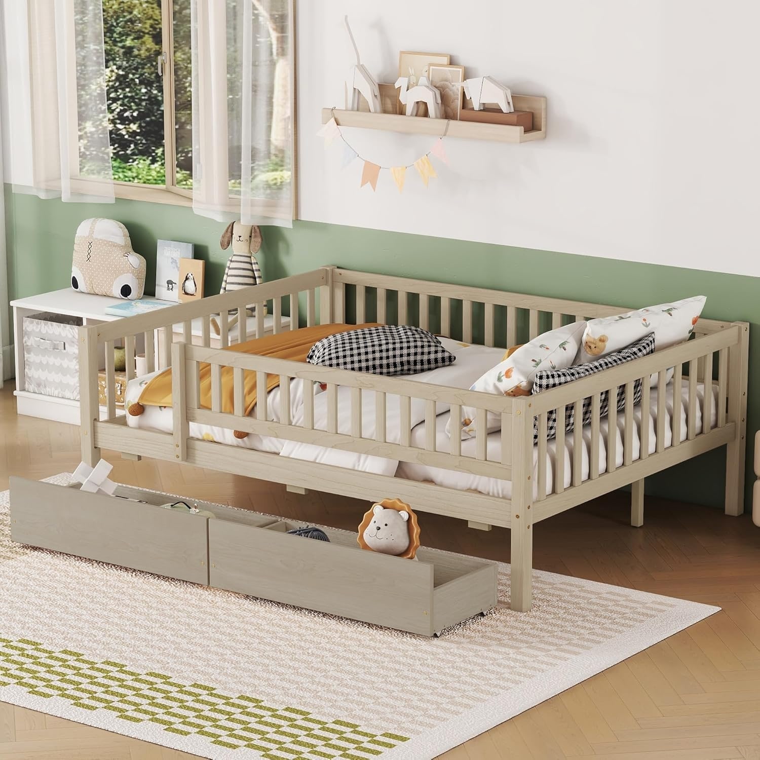 Full Size Daybed with Two Drawers, Wood Platform Bed Frame with Storage and Rails, No Box Spring Needed, Easy Assembly