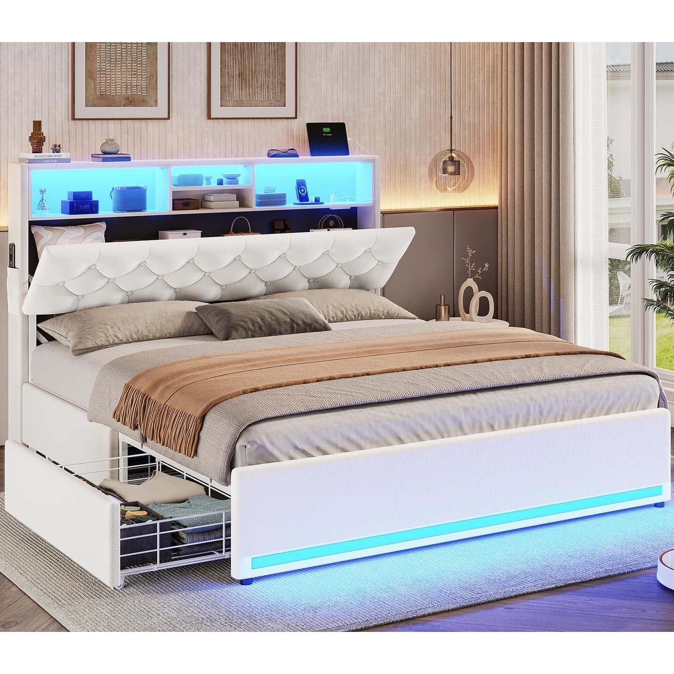 Queen Bed Frame with Charging Station & LED, Upholstered Headboard with Drawers, Heavy Duty Metal Slats, No Box Spring Needed