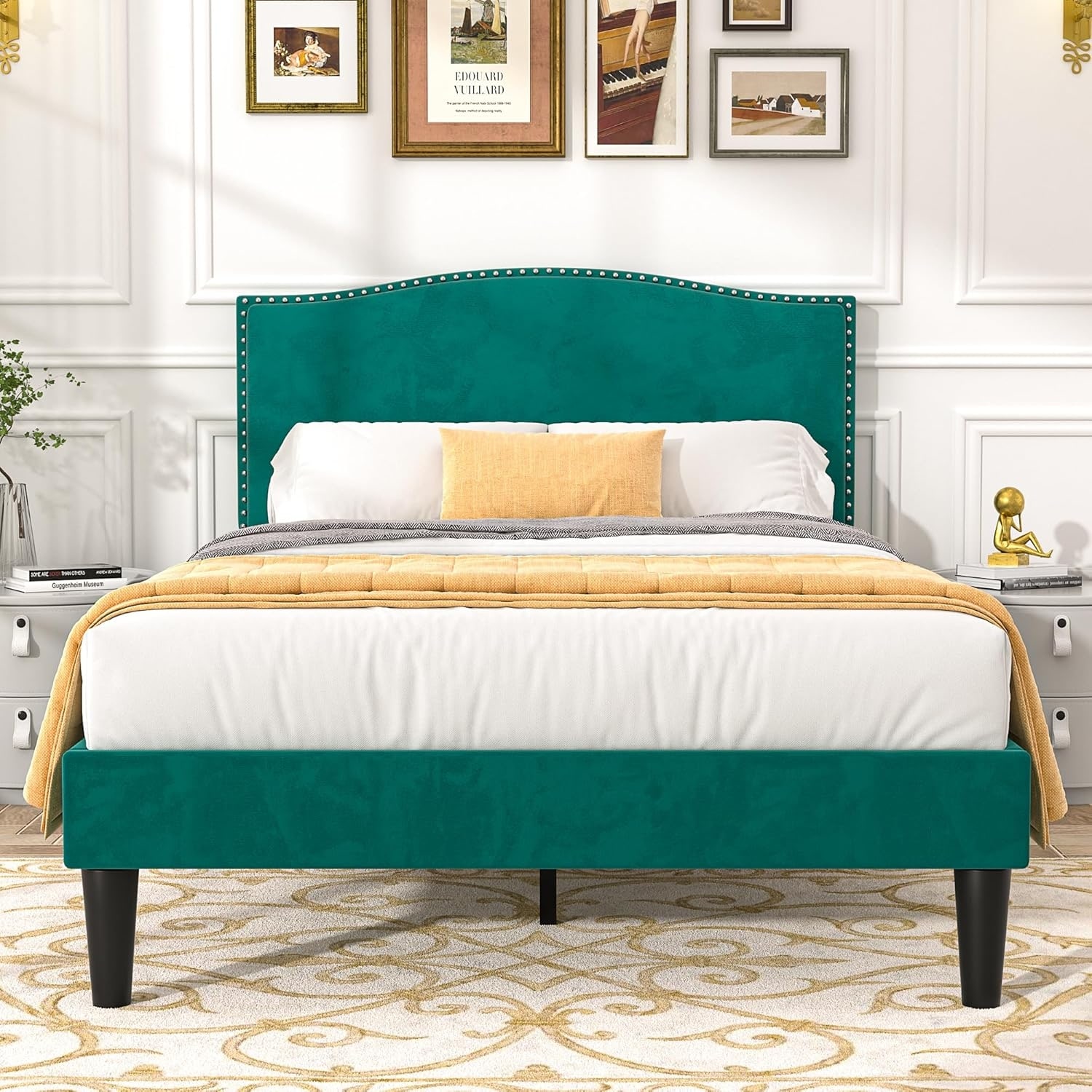 Twin Bed Frame with Adjustable Height Headboard, Velvet Upholstery, Sturdy Wooden Slats, Noise-Free, Easy Assembly, Dark Green