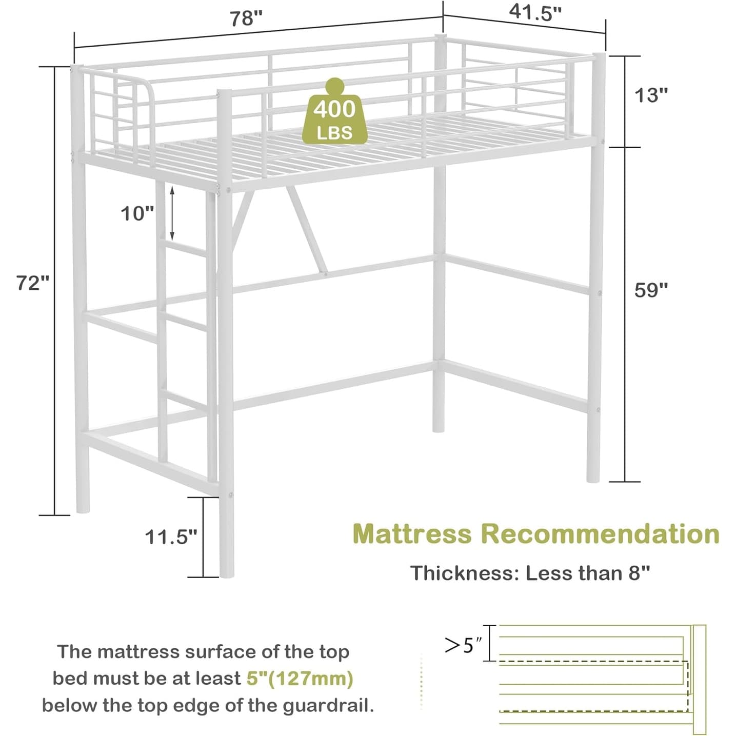Twin Size Metal Loft Bed with Ladder & Safety Guardrail, Space Saving Design, No Box Spring Needed, Noise Free, White
