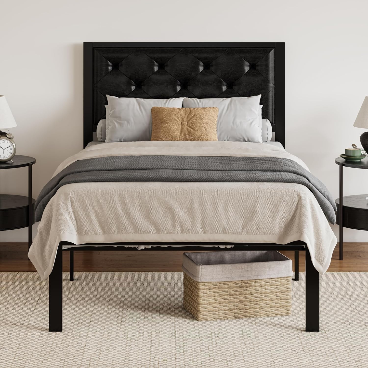 Twin Size Metal Platform Bed Frame with Upholstered Headboard, Under-Bed Storage, Noise-Free, Easy Assembly, Black