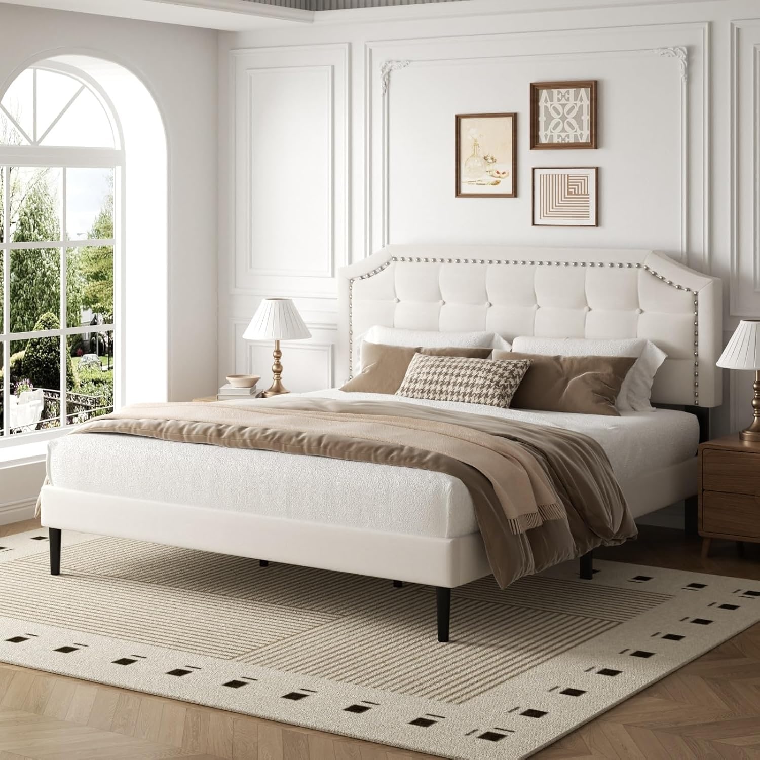 Queen Size Upholstered Platform Bed Frame with Headboard, No Box Spring Needed, Easy Assembly