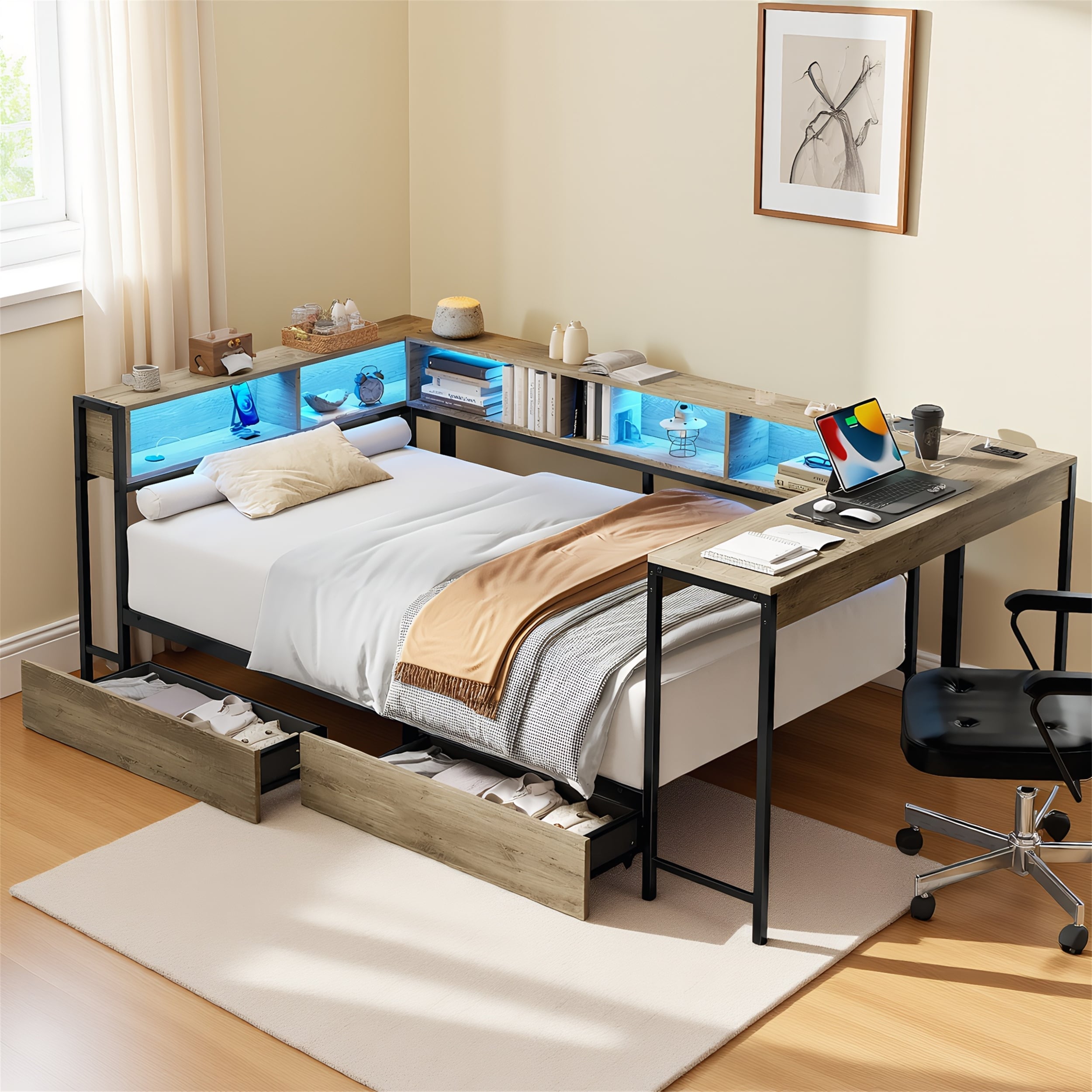 Full Size Corner Bed Frame w/ LED Lights, Bookcase, 2 Storage Drawers