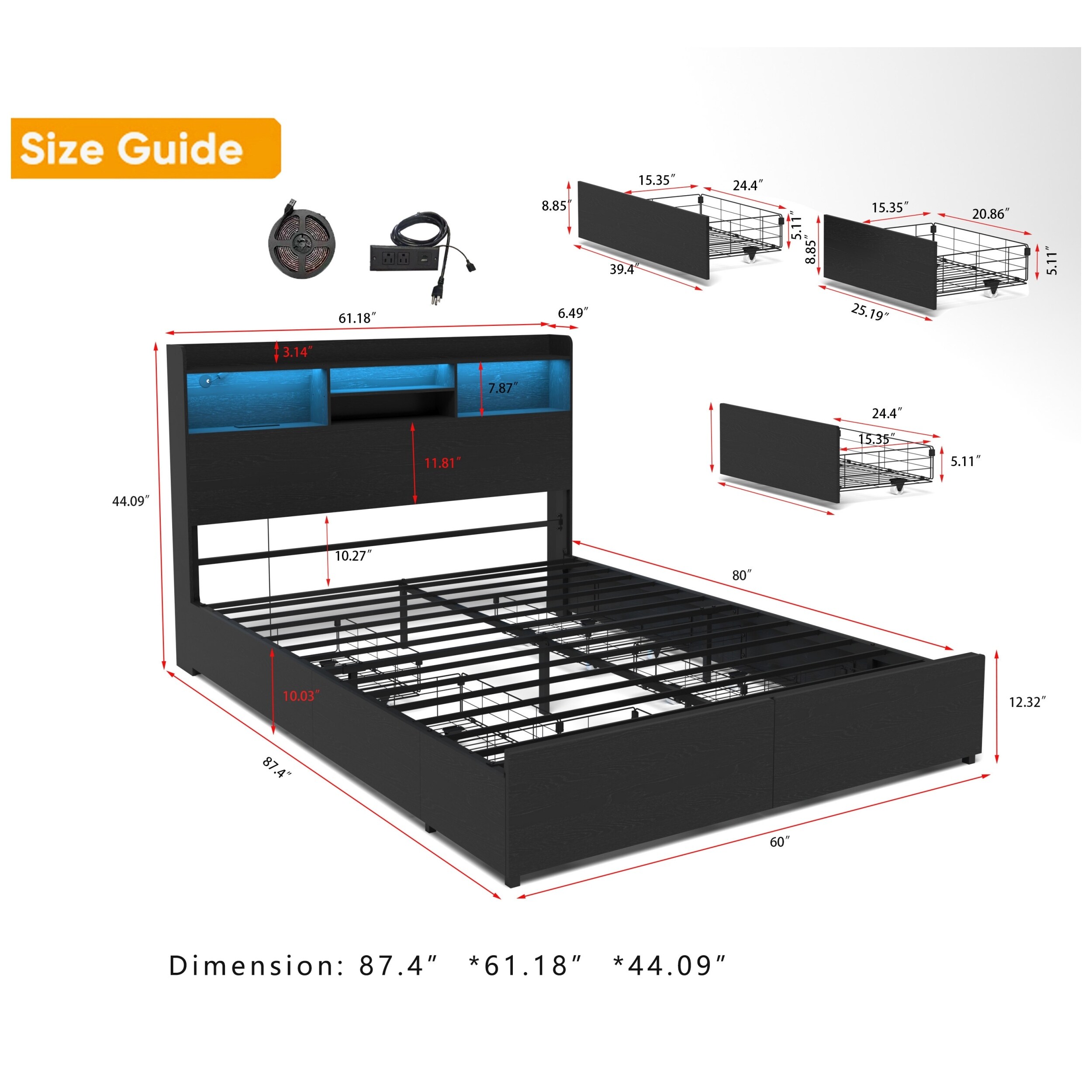 Full/Queen Size Bed Frame with Drawers & Charging Headboard, 1100LBS