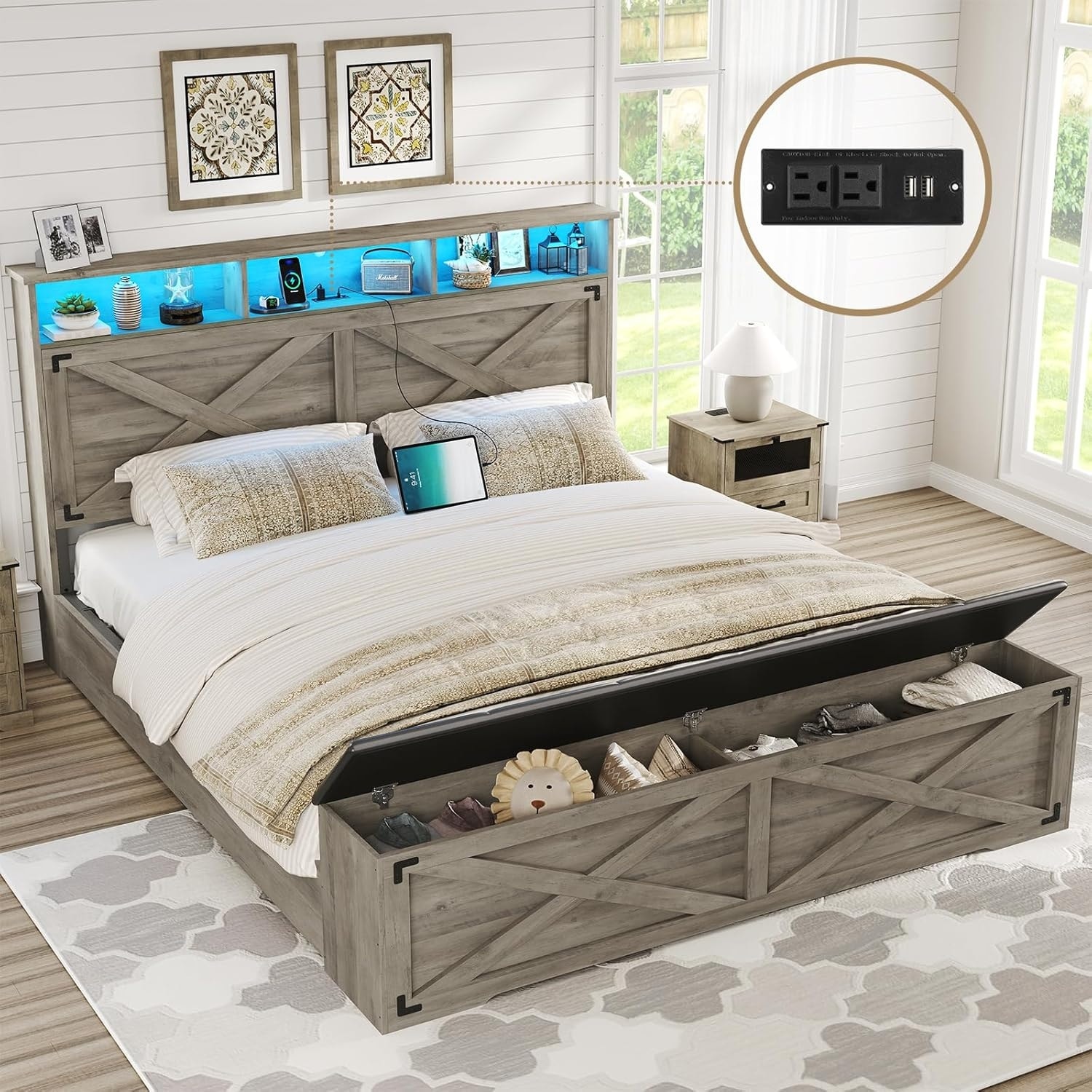Queen Size Farmhouse Bed Frame with Storage, Charging Station, Ottoman, and LED Lights, No Box Spring Needed, Oak Gray Finish