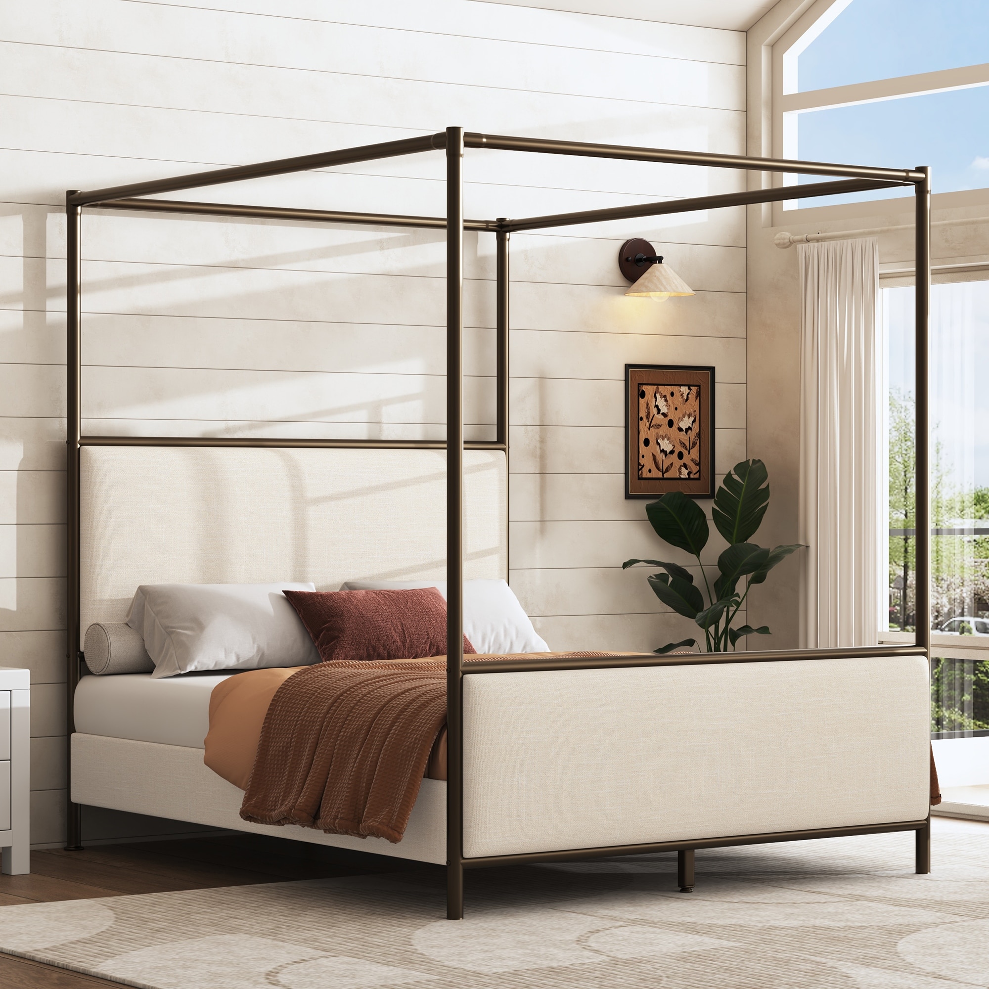 Queen Size Canopy Bed Frame With Linen Upholstered Headboard, Iron Legs