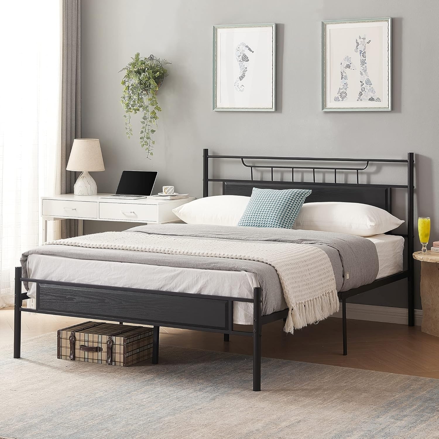 Metal Platform Bed Frame with Headboard, Wood Slat Support, Easy Assembly, King, Black